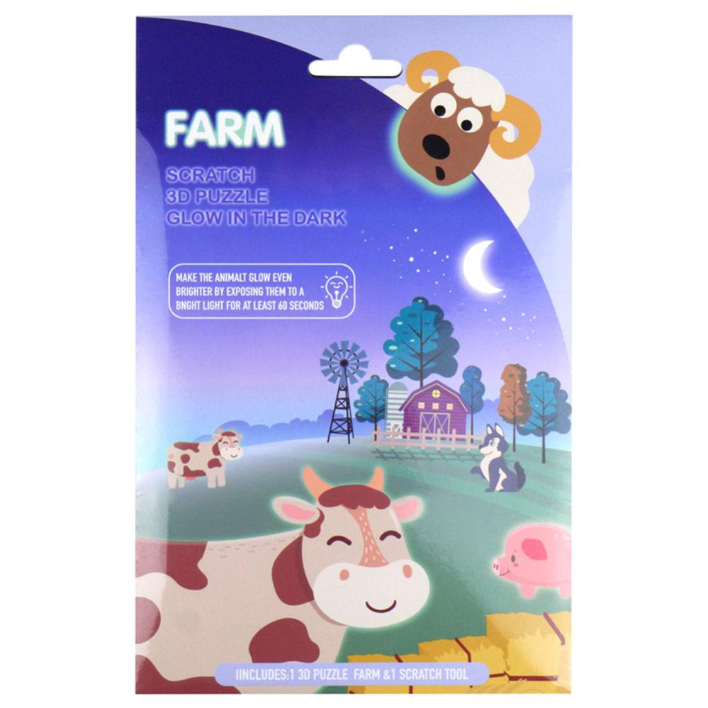 3D Skrapepuslespill Gårdsdyr er et 3D-puslespill med skrapeeffekt, noe som innebærer at du først skraper frem puslespillbitenes farger, lik et skrapelodd. Deretter setter du enkelt sammen bitene til en stående 3D-figur. Skrapeverktøy følger med. Puslespillet finnes i fire ulike varianter med gårdsdyr, hvilket dyr du får blir en overraskelse. Figuren kan også lyse i mørket ved å utsettes for sterkt lys i minst 60 sekunder.