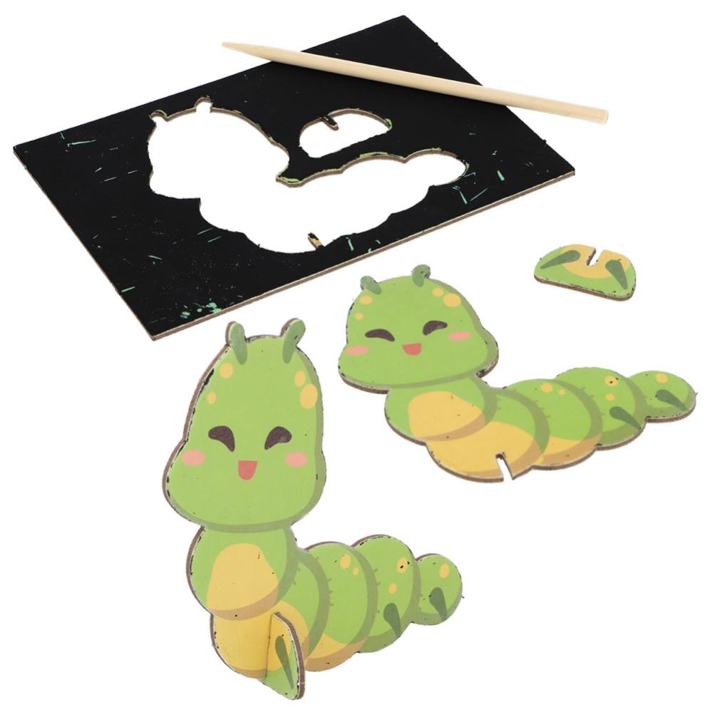 3D Skrapepuslespill Insekter omfatter et 3D-puslespill med skrapeeffekt, noe som innebærer at du først skraper frem puslespillbitenes farger lik et skrapelodd. Deretter setter du enkelt sammen bitene til en stående 3D-figur. Skrapeverktøy medfølger. Puslespillet finnes i fire ulike varianter av insekter, hvilket insekt du får blir en overraskelse. Figuren kan også lyse i mørket ved å utsettes for sterkt lys i minst 60 sekunder.