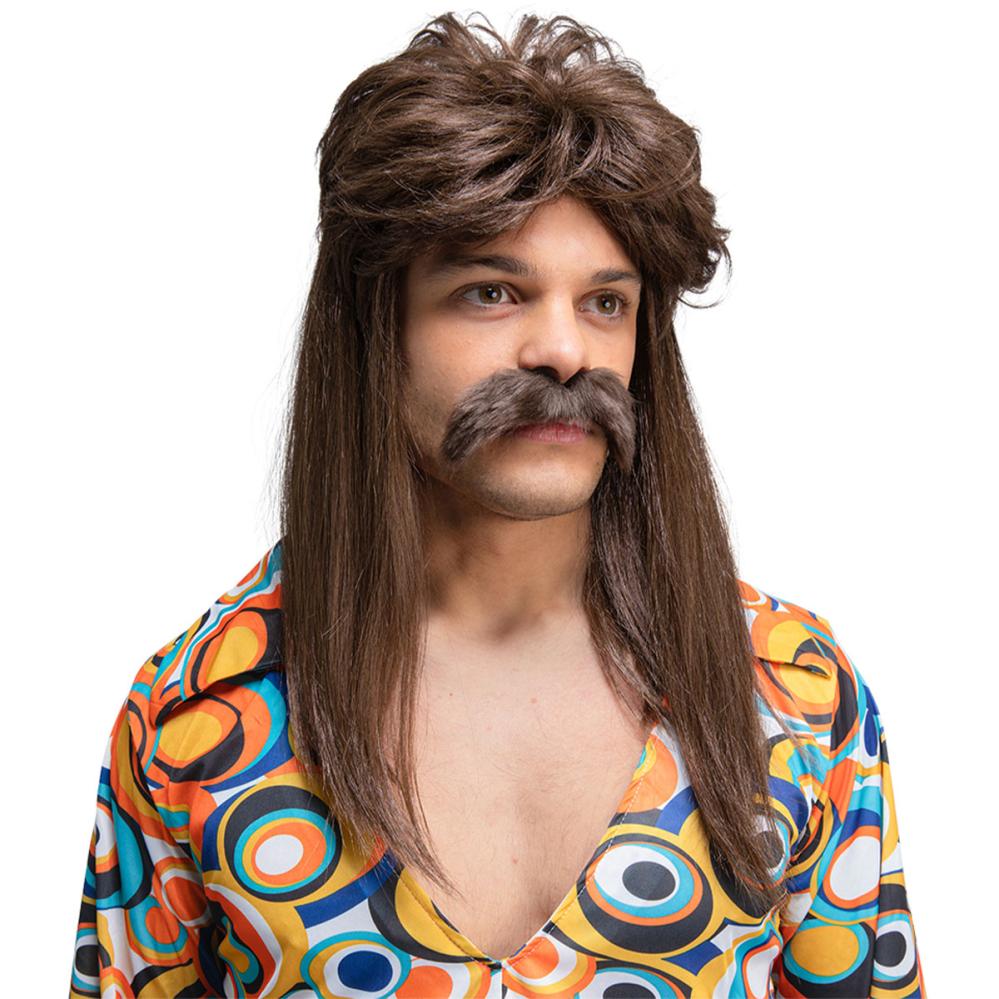 70-talls Parykksett Mørkebrun er et komplett kostymesett for deg som vil skille deg ut på en 70-talls temafest. Med en klassisk hockeysveis parykk og selvklebende bart får du en fullendt mullet parykk-look.