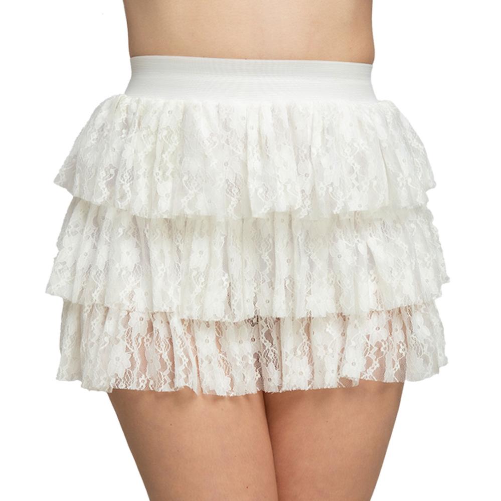 Gi 80-tallsutkledningen din en ekstra touch med dette korte hvite skjørtet med tre lag med volanger. Skjørtet er perfekt til 80-tallsfester, maskerader og alle anledninger der et hvitt blondeskjørt løfter stilen.