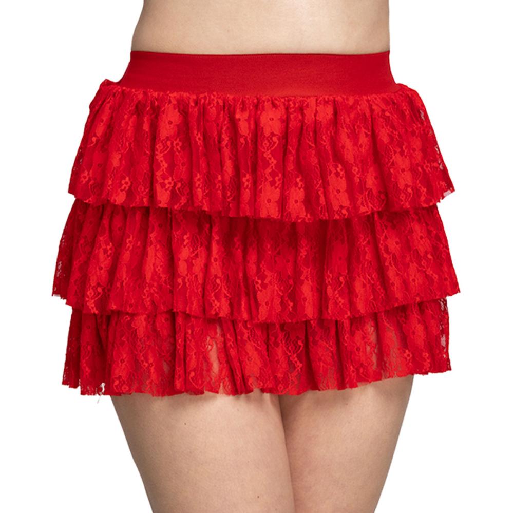 Sett stilen på neste 80-tallsfest med et rødt blondeskjørt som har tre lag med volanger og en behagelig elastisk midje. Dette er et perfekt skjørt til en 80-tallsutkledning på kostymefest eller når du trenger unike klær på fest.