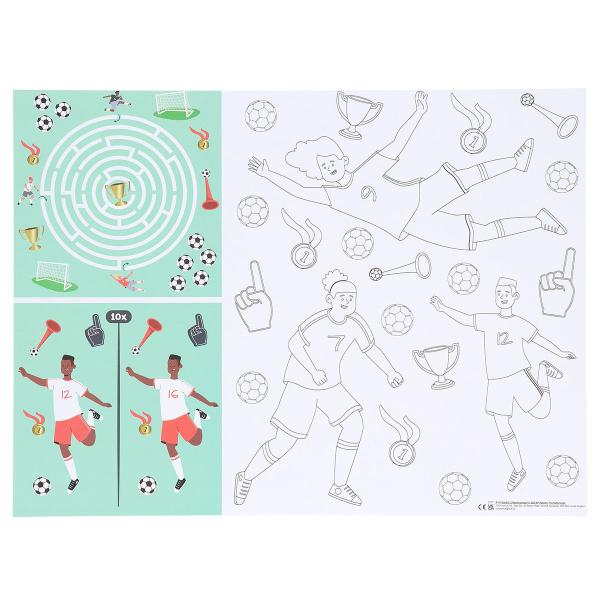 Aktivitetsbordbrikker Fotballbursdag 6-pakning omfatter seks papirbrikker med fotballtema, hver med tre morsomme aktiviteter: en labyrint som leder til gullpokalen, ”finn ti forskjeller” og et stort motiv til å fargelegge.