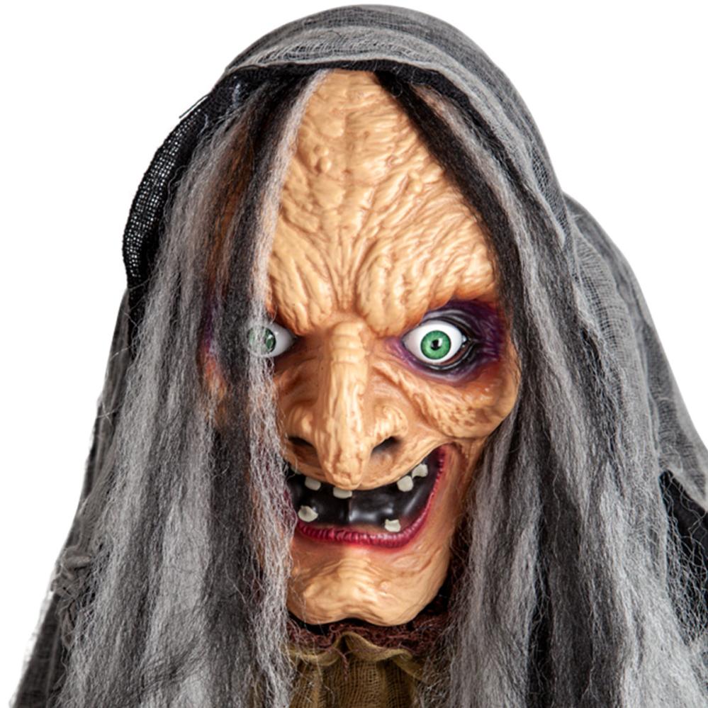 Skrem opp halloweenfeiringen med en animatronisk Halloween-rekvisitt som virkelig merkes. Denne animerte heksen, en Halloween-dekorasjon, beveger seg, lyser og ler ondskapsfullt. Dette er en perfekt Halloween-rekvisitt og halloweendekorasjon med lys, lyd og bevegelse.