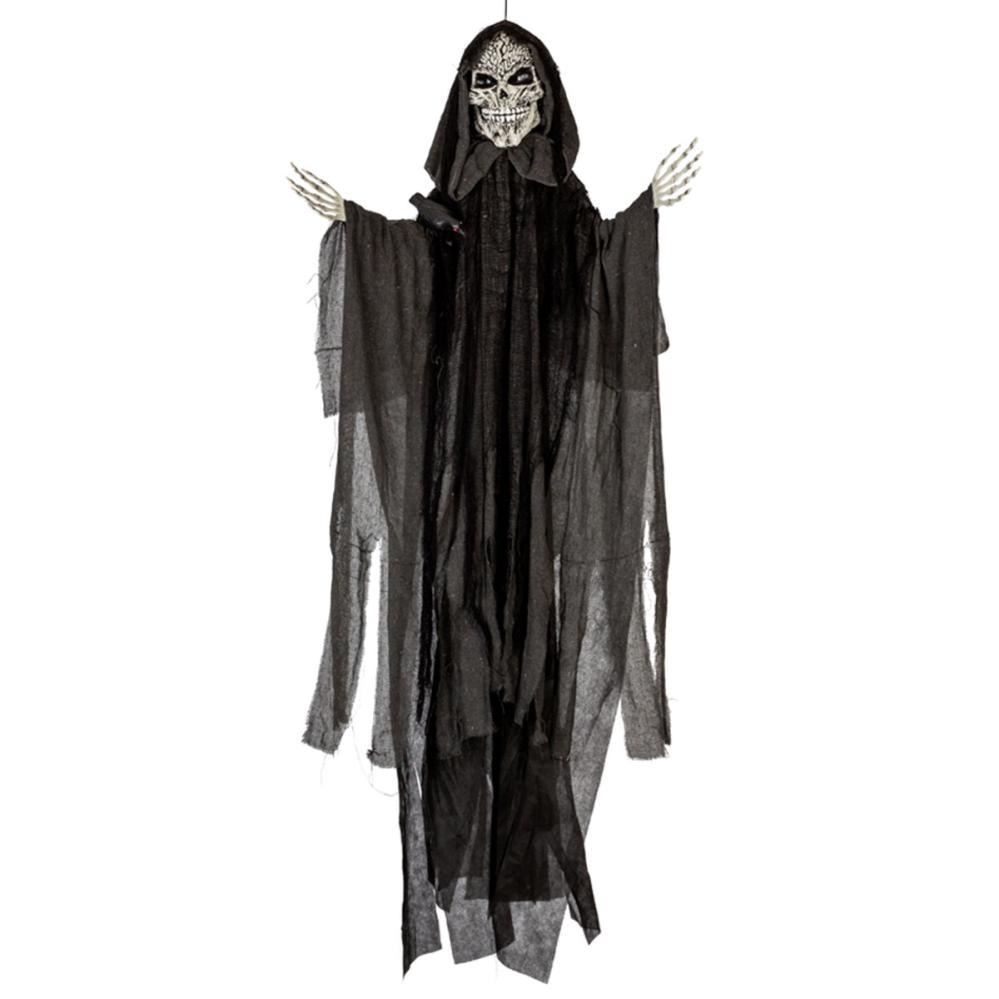 Under halloween skaper den animerte hengende figuren i form av mannen med ljåen en uhyggelig stemning i hver dekorasjon. Denne halloween-rekvisitten gir liv til rommet med sine unike detaljer. Ved en halloweenfest bidrar dekorasjonen til en minneverdig opplevelse for gjestene.
