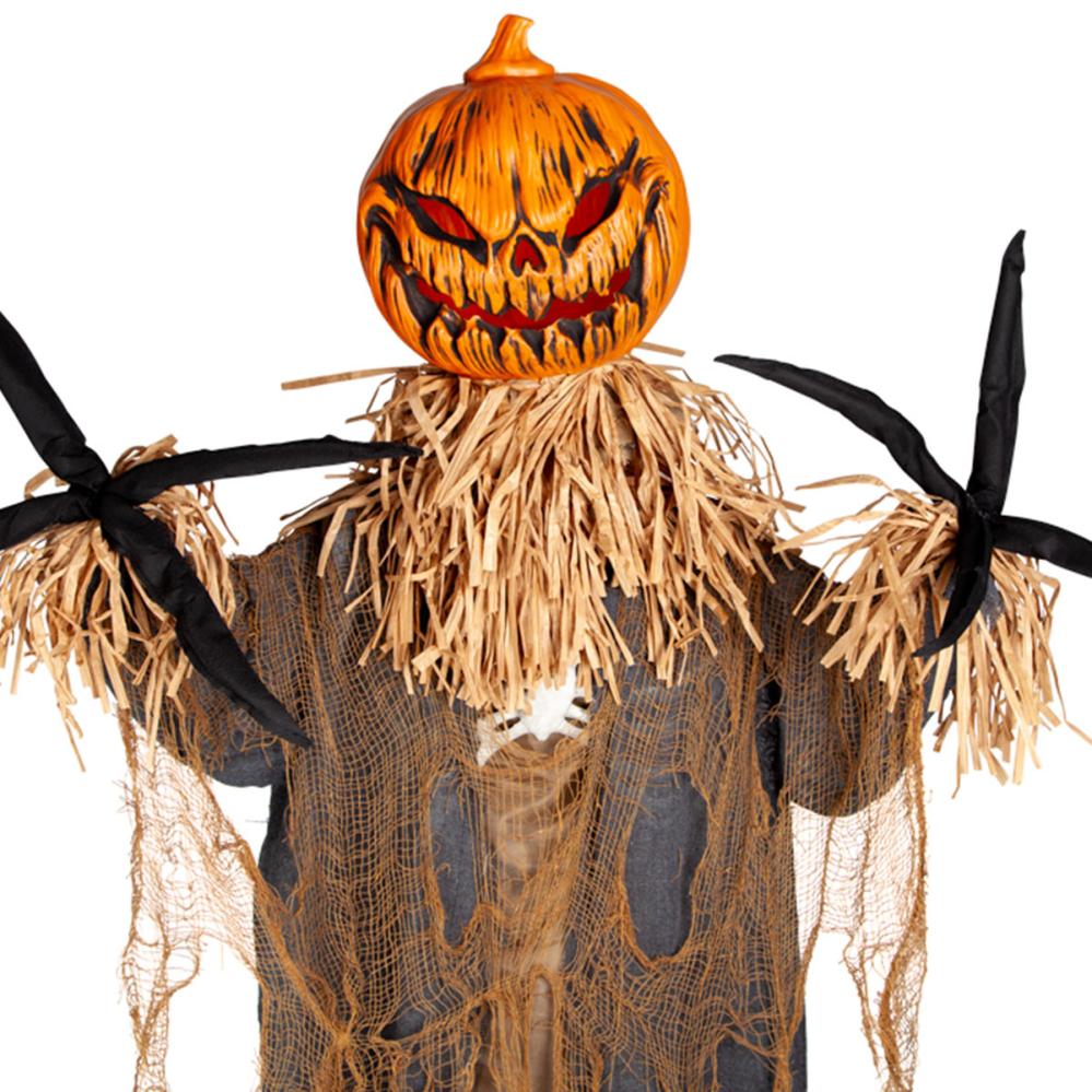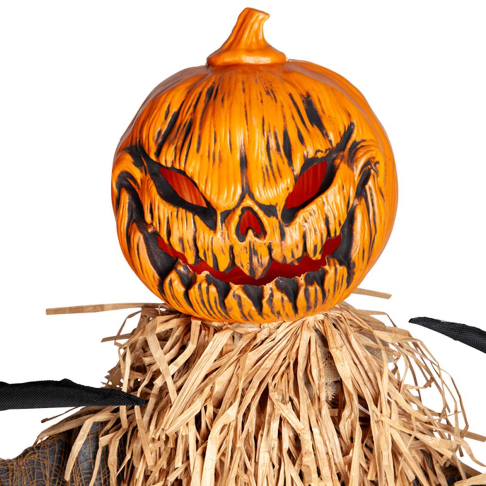 Animert Ond Gresskarfugleskremsel 183 cm er en Halloween-rekvisitt i form av et stort fugleskremsel som lager lyd, lyser og beveger seg. Fugleskremselet har et stort oransje gresskarhode, fylling av falsk halm, trasige klær, skjelettbryst og lange spisse fingre. Gresskarhodet lyser opp med LED-lys og beveger seg fra side til side samtidig som det gir fra seg en truende knurring.