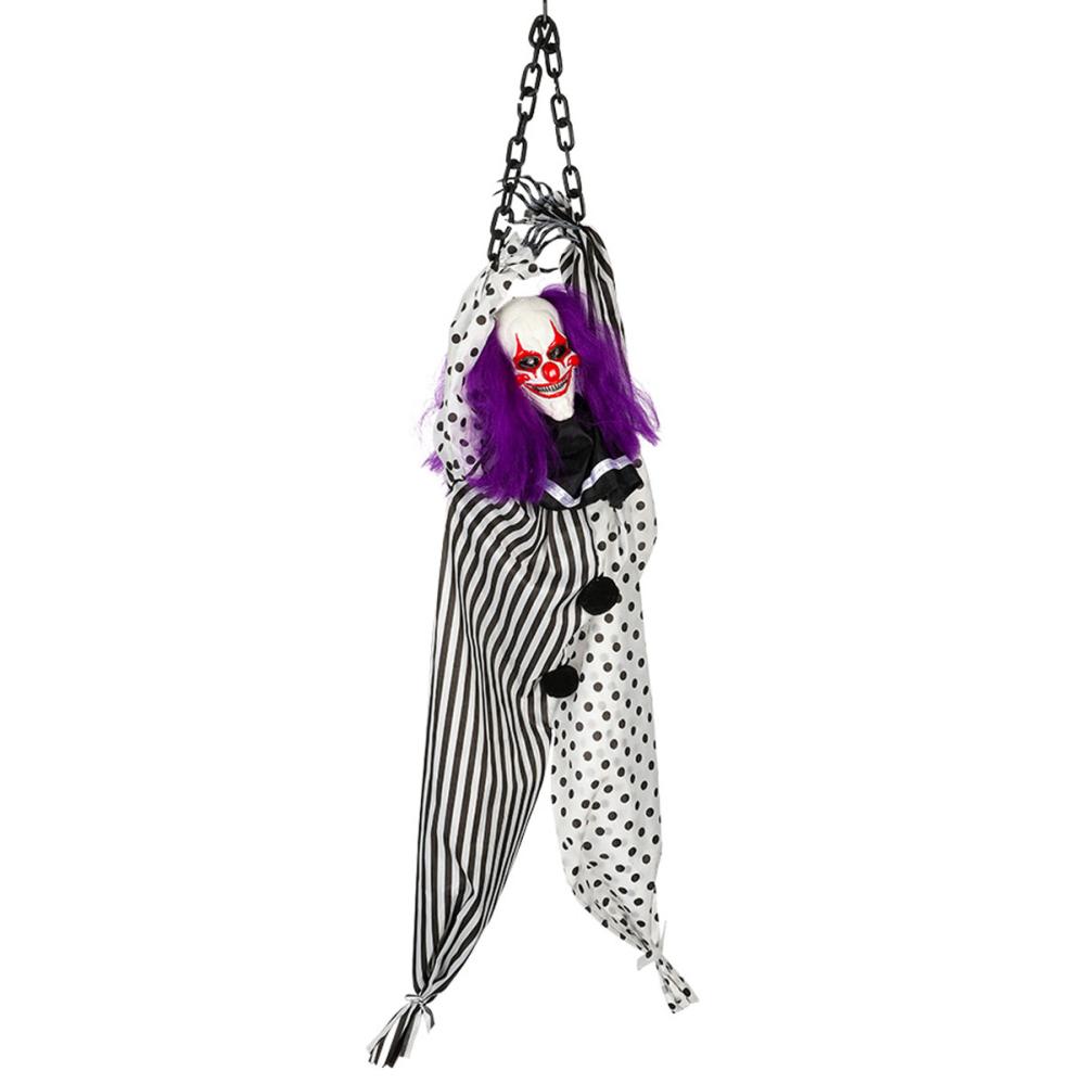 Animert Ristende Klovn i Lenker 100 cm omfatter en hengende halloweenfigur med bevegelse, lyd og lys i form av en skummel klovn. Figuren henger i lenker, har lilla hår, rød klovnesminke og er kledd i en klassisk svart-hvit klovnedrakt. Ved aktivering rister klovnen ukontrollert, avgir uhyggelige lyder og blinker med lysende øyne.