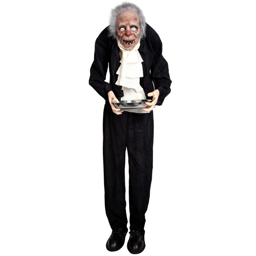 Animert Skummel Gammel Butler 153 cm er en Halloween-rekvisitt i form av en gammel butler som lager lyd, lyser og beveger seg. Butleren har detaljerte ansiktstrekk og kort grått hår, er kledd i svart dress med hvit volangskjorte og bærer et sølvfarget serveringsbrett. Han har blinkende røde øyne og beveger hodet mens han kakler ondskapsfullt.