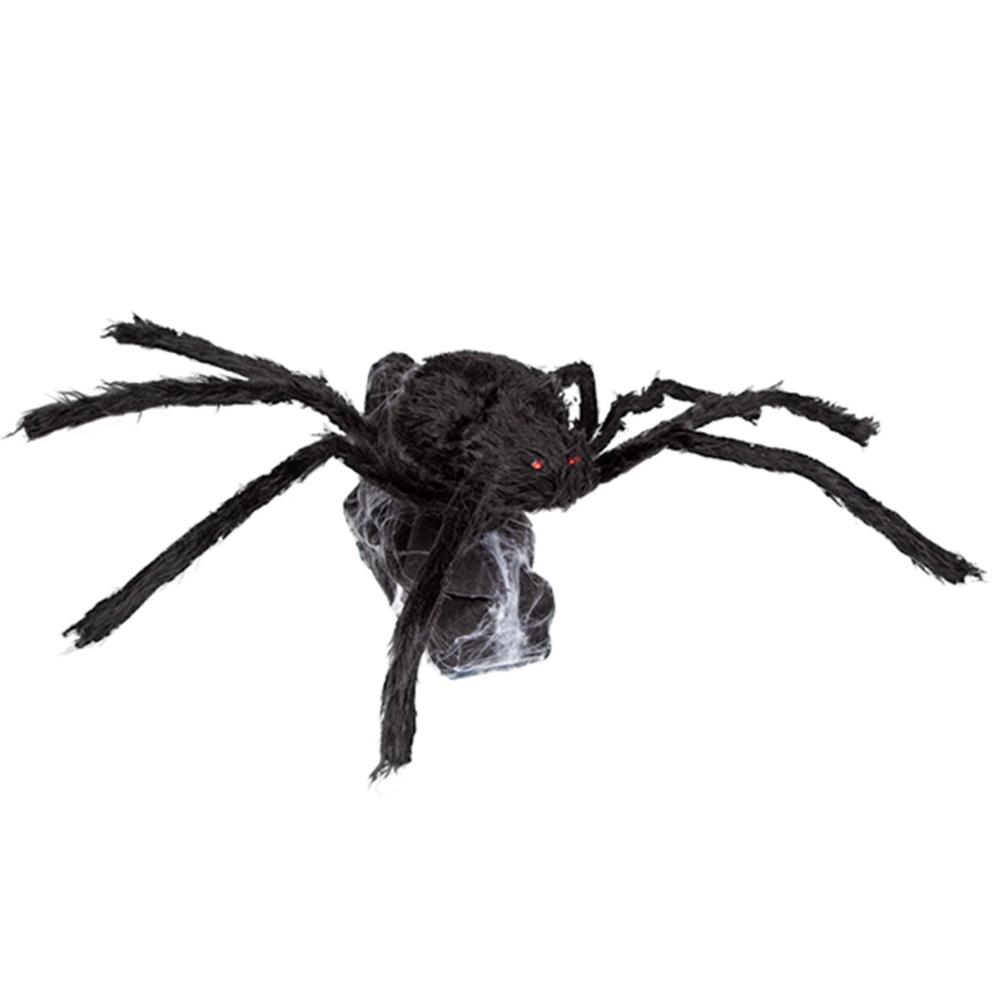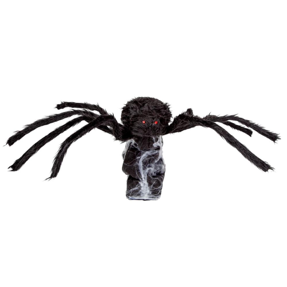 Animert Skummel Hoppende Edderkopp 70 cm omfatter en Halloween-rekvisitt med lydaktivering som forestiller en stor, hårete svart edderkopp med lyd, lys og bevegelse. Edderkoppens bein er formbare og den sitter på en liten plattform som er dekket med hvitt spindelvev. Når den aktiveres kaster edderkoppen seg frem, med rødt blinkende øyne og en skremmende lyd. Deretter spilles en kort melodi mens den langsomt trekker seg tilbake. OBS! Det finnes en skjult på/av-knapp under spindelvevet som brukes til å slå på den lydaktiverte modusen.