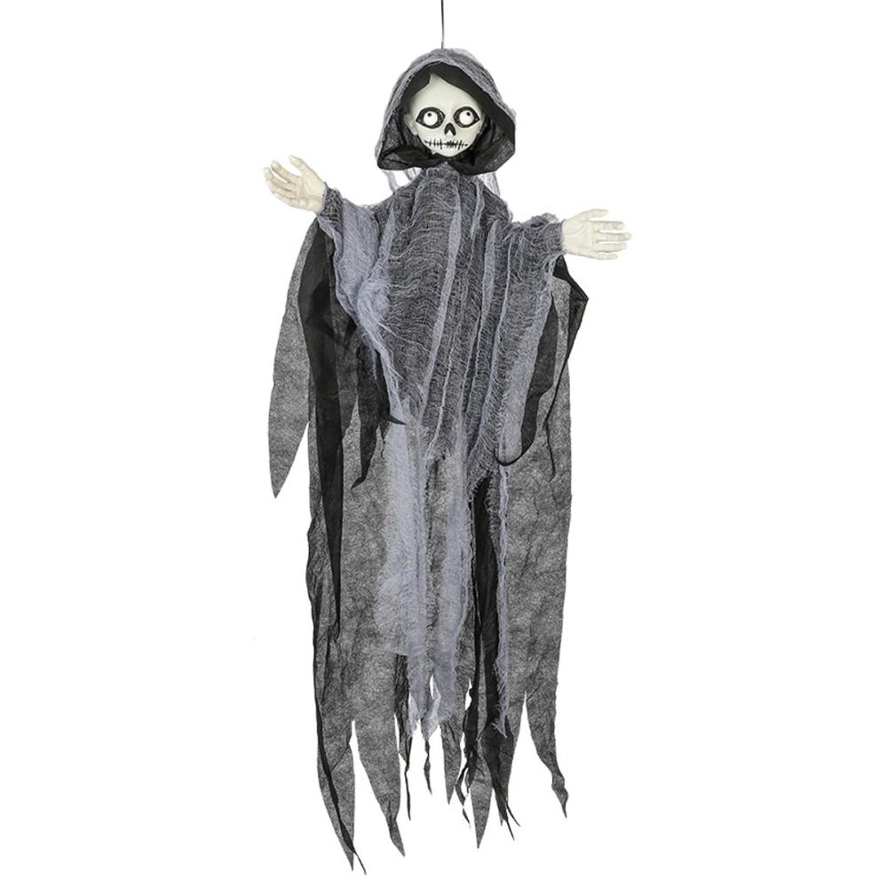 Animert Syngende Spøkelsesjente Prop 110 cm er en skummel hengende spøkelsesjente med bevegelse, lys og lyd. Denne batteridrevne halloweenfiguren har et sminket ansikt med stirrende øyne og en slitt kappe i svart og hvitt. Ved lydaktivering lyser øynene, kroppen beveger seg og hun både snakker og synger på engelsk.