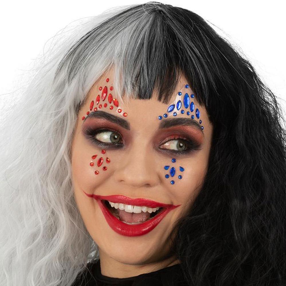 Forvandle looken med disse fargerike ansiktssmykkene. Fire selvklebende face jewels med rød og blå strass gjør hvert antrekk klart for fest. Disse er perfekte ansiktsjuveler for festival, maskerade eller en kreativ sminke.