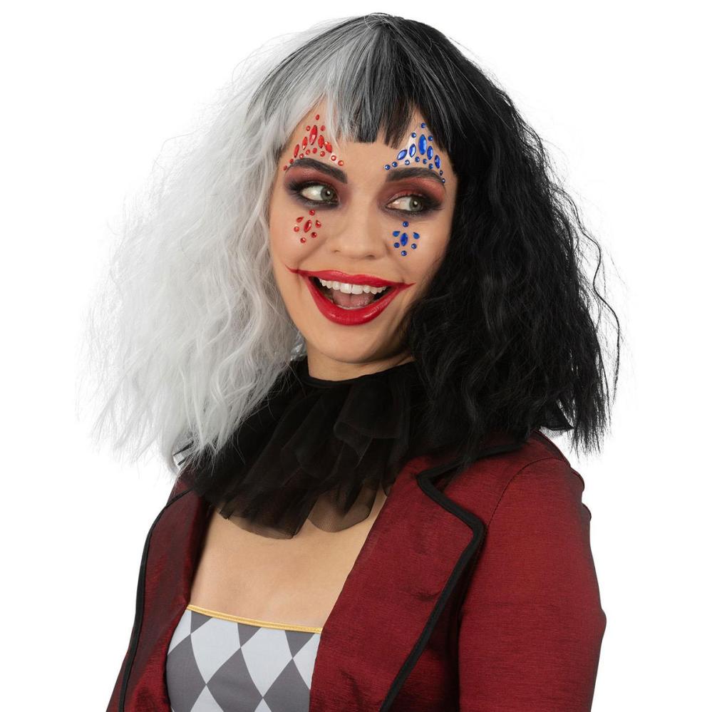 Ansiktssmykker Gjøgler omfatter fire selvklebende ansiktssmykker med rød og blå strass i ulike størrelser. Steinene sitter på gjennomsiktige klistremerker med selvklebende bakside. Påfør dem ved å dra forsiktig av hvert klistremerke fra plasten og trykk dem mot ren og tørr hud.