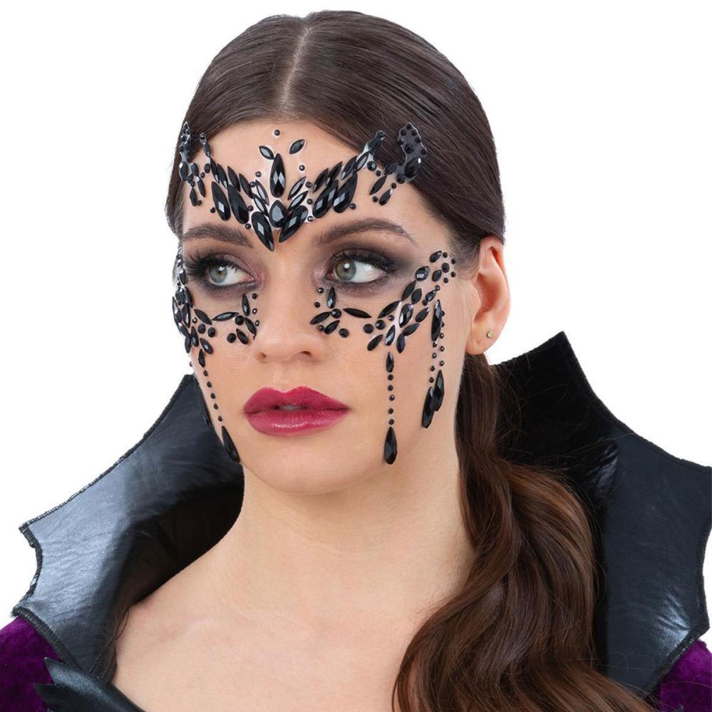 Løft looken din med disse elegante face jewels i svart diamantdesign. Åtte selvklebende ansiktssmykker påføres enkelt på tørr hud og skaper en dramatisk effekt perfekt til maskerade. Stilrene ansiktsjuveler som gjør deg til festens midtpunkt.