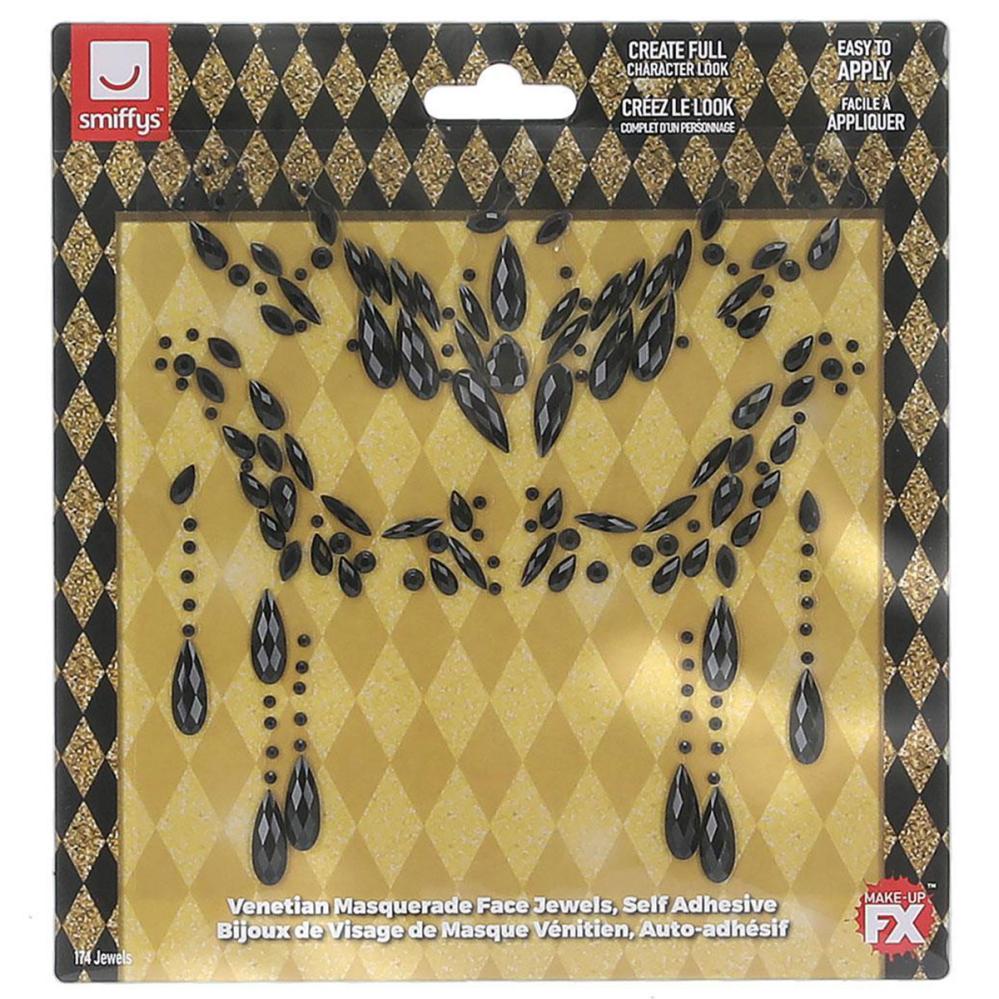 Ansiktssmykker Venetiansk Maskerade består av åtte selvklebende ansiktssmykker med svarte diamanter i varierende størrelser. Diamantene sitter på gjennomsiktige stickers med selvklebende bakside. Påfør dem ved forsiktig å trekke av hver sticker fra plasten og trykke dem fast mot ren og tørr hud.