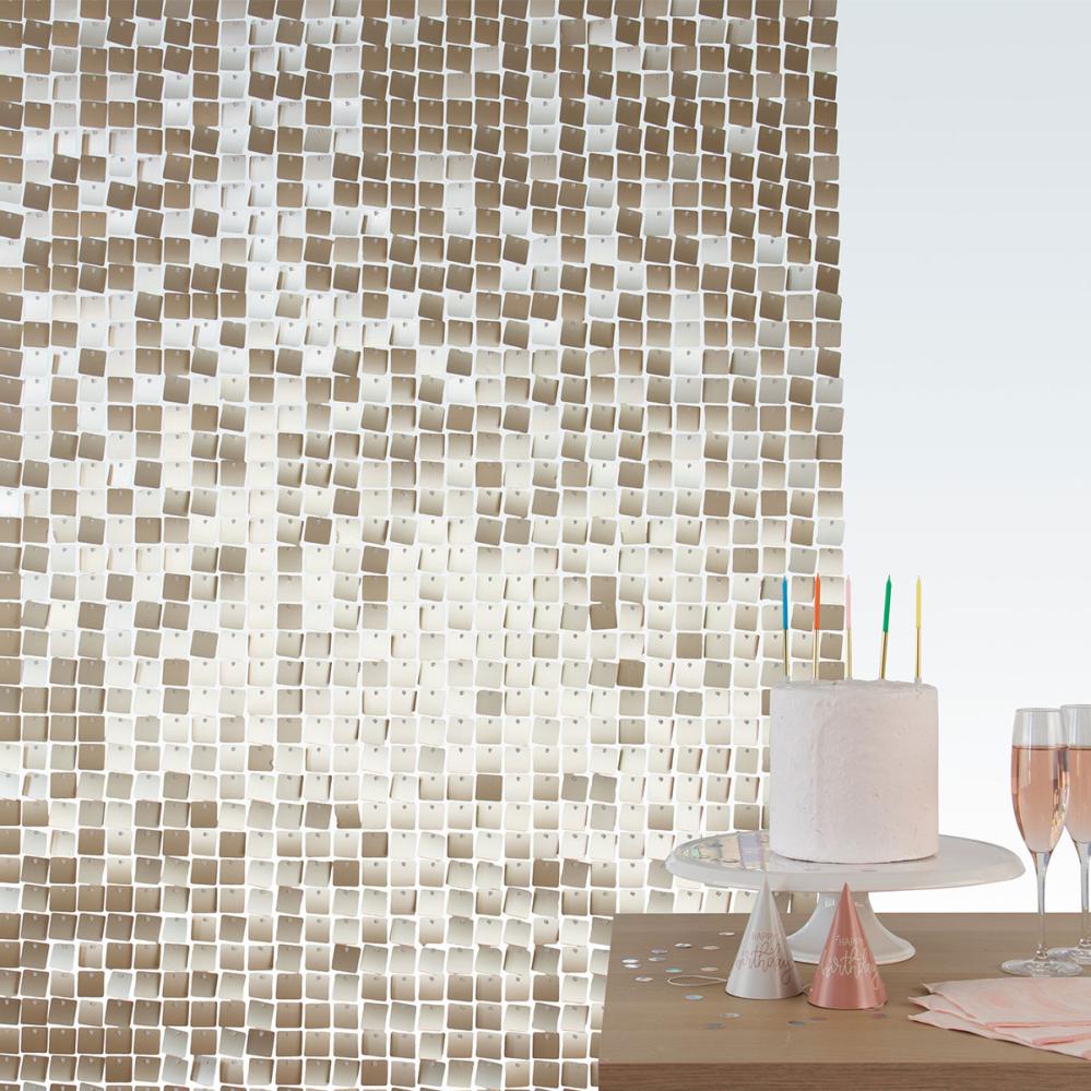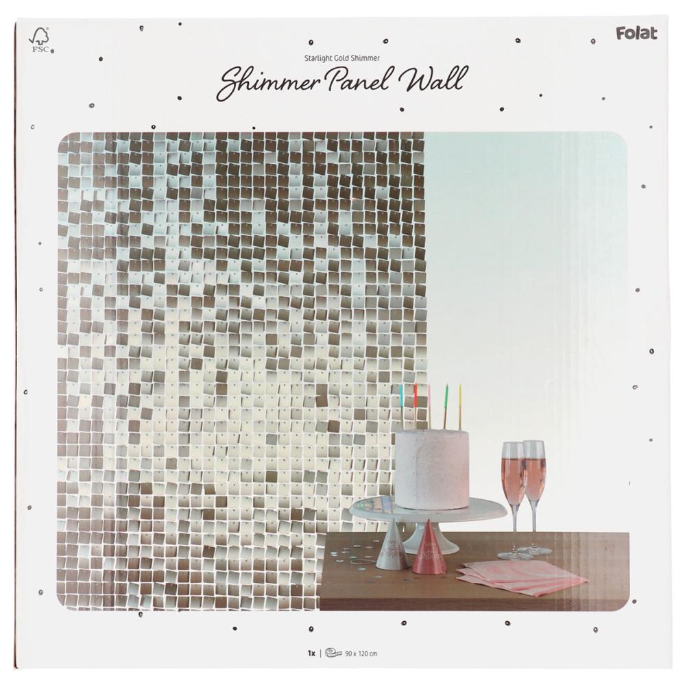 Skap en glamorøs partydekorasjon og bakgrunn med Backdrop Paljettpanel Starlight Gold 30x30 cm 12-pakning. De tolv panelenes gullpaljetter gir en skimrende effekt, perfekt som festdekorasjon eller backdropdekorasjon for alle typer av arrangementer.