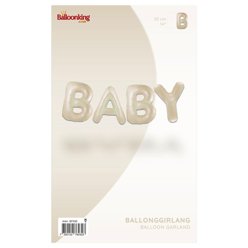 Ballonggirlander Baby Kremfarget består av fire bokstavformede folieballonger som sammen danner ordet ”BABY” i kremfarge. Ballongene fylles med luft med det medfølgende blåserøret og har løkker for enkel oppheng med den hvite snoren som følger med.