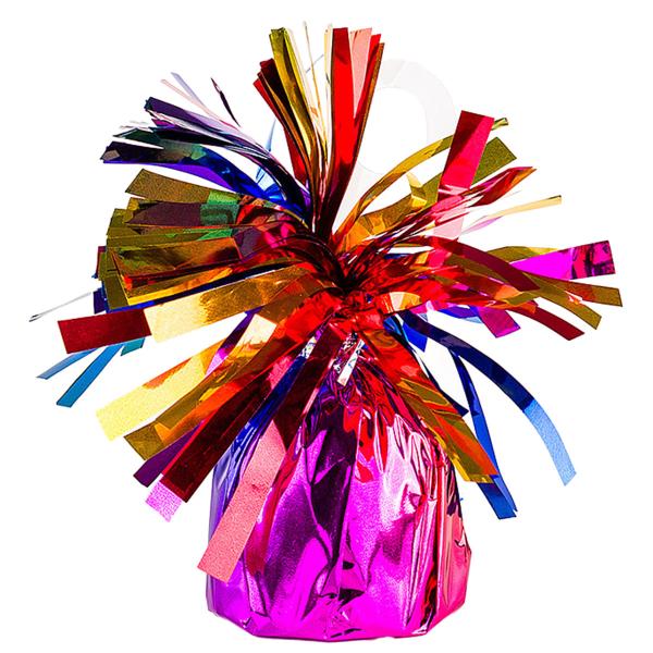 Ballongvekt Regnbue er en vekt til ballonger med skimrende regnbuefarger i folie og har en løkke øverst for å feste heliumballonger med ballongsnorer.