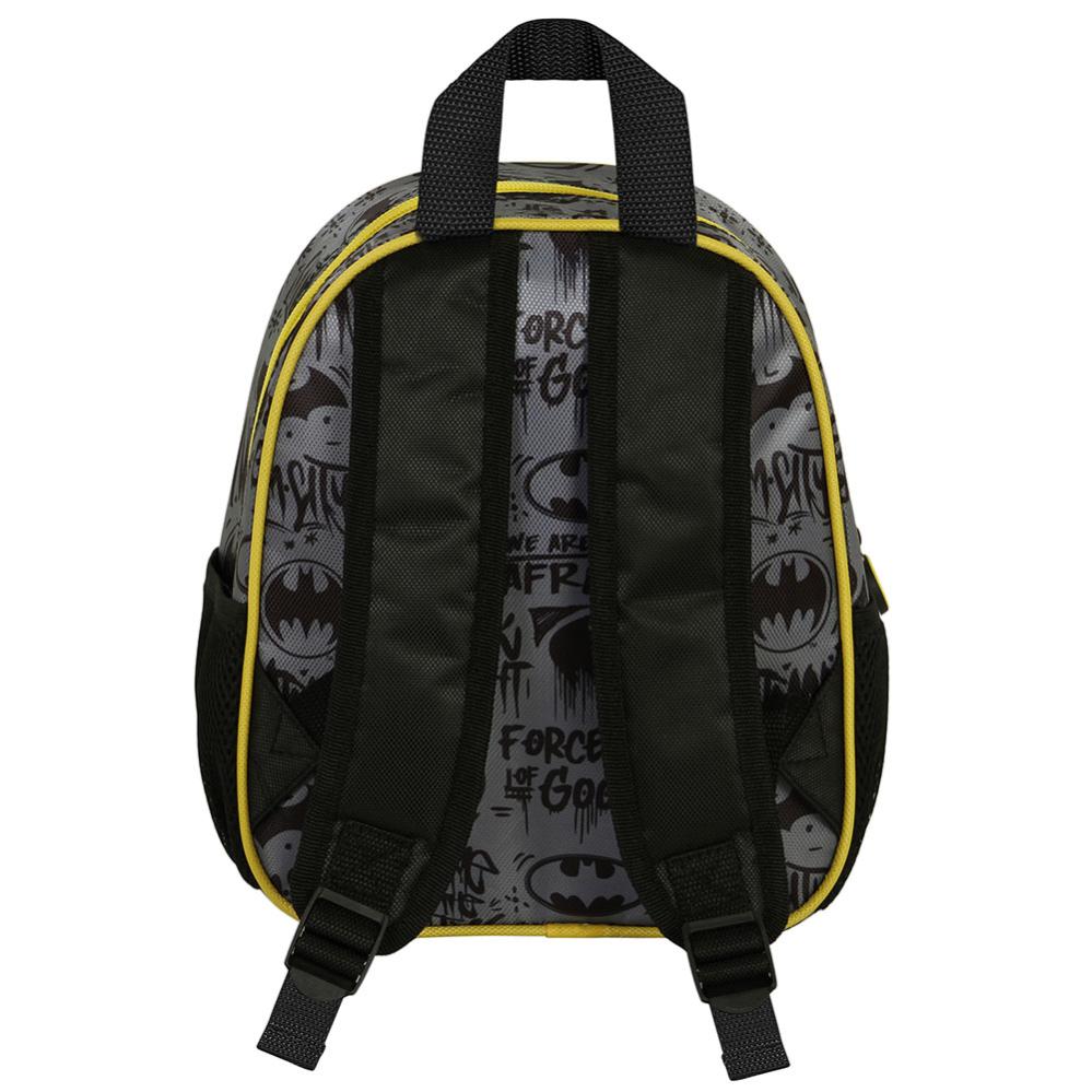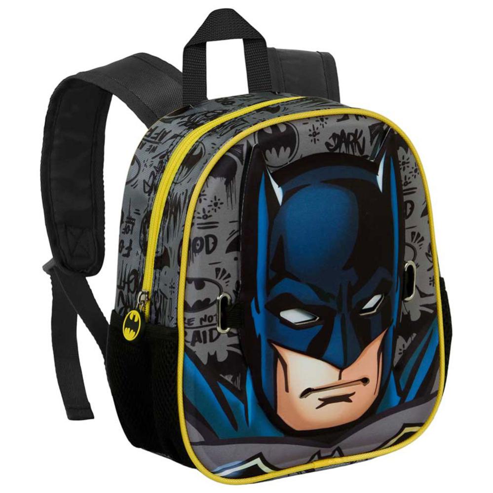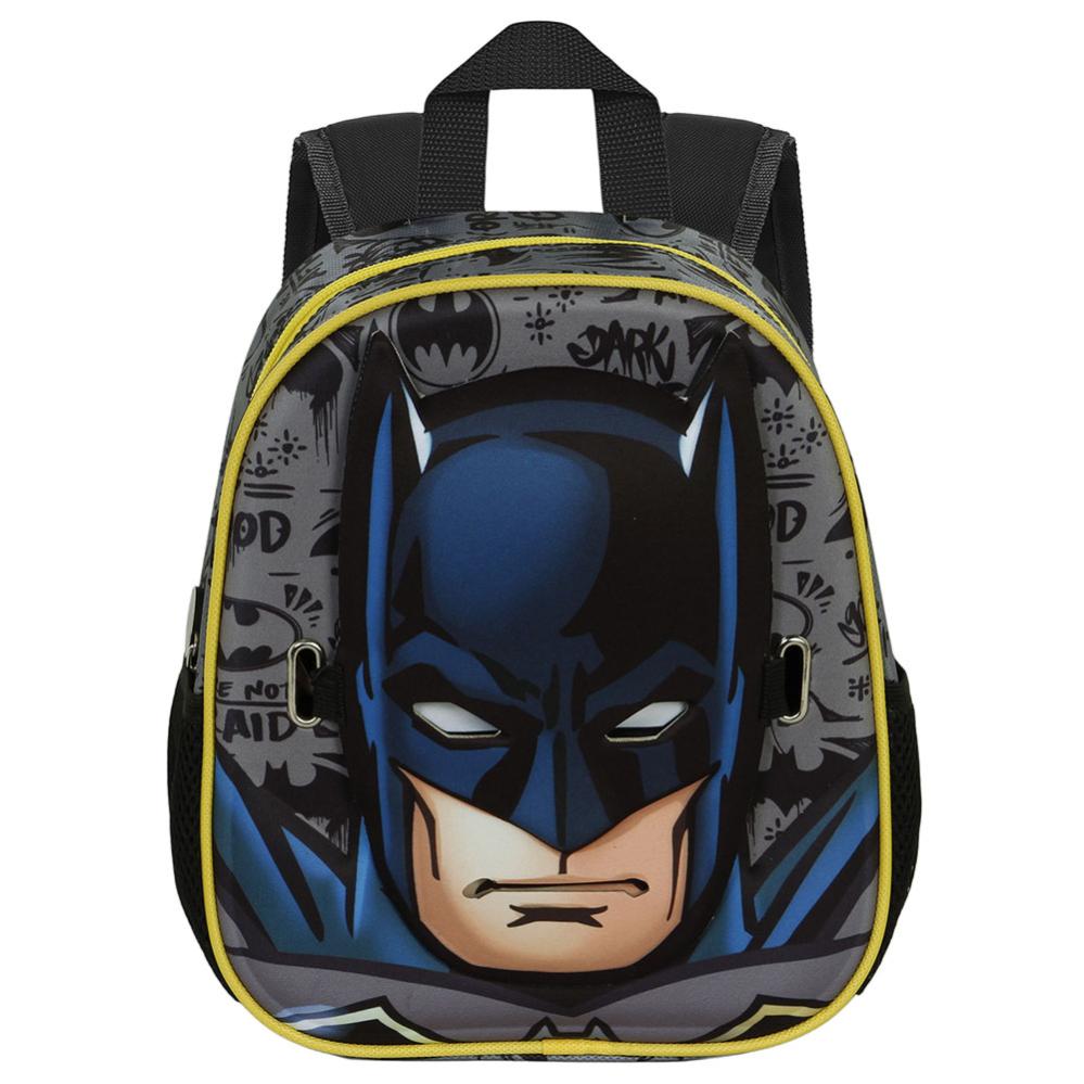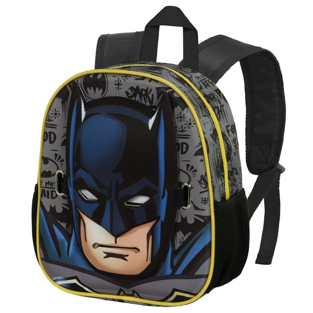 Batman 3D Ryggsekk omfatter en barneryggsekk i Batman 3D-motiv. Ryggsekken har et bærehåndtak, justerbare polstrede skulderstropper, to nettinglommer på sidene og et rom med glidelås.
