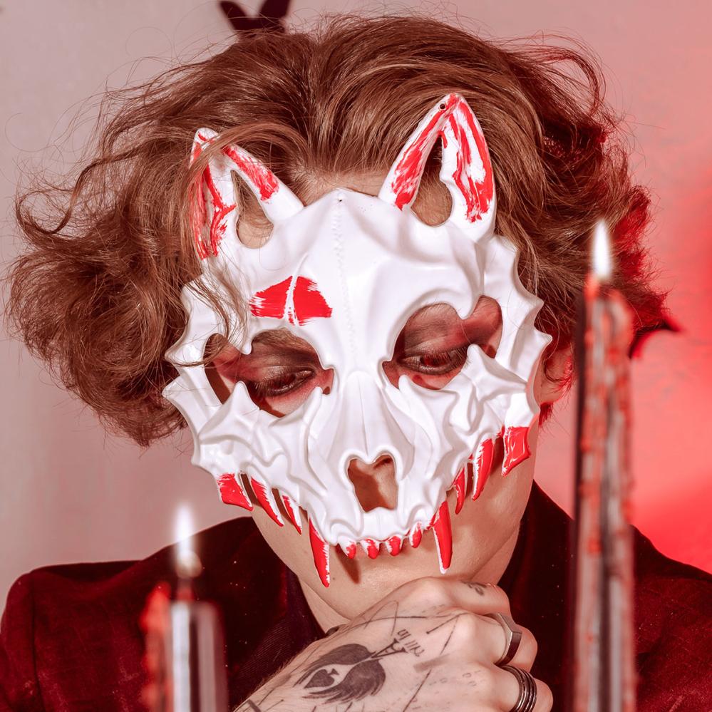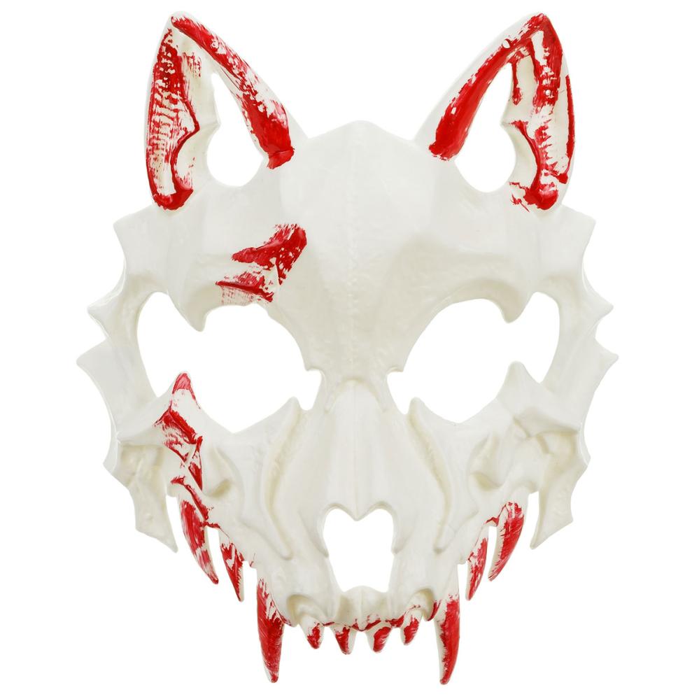 Blodig Ulveskalle Halvmaske omfatter en halvmaske som forestiller en hvit og blodig ulveskalle. Masken har hull for nese og øyne samt et svart elastisk bånd som holder den på plass.