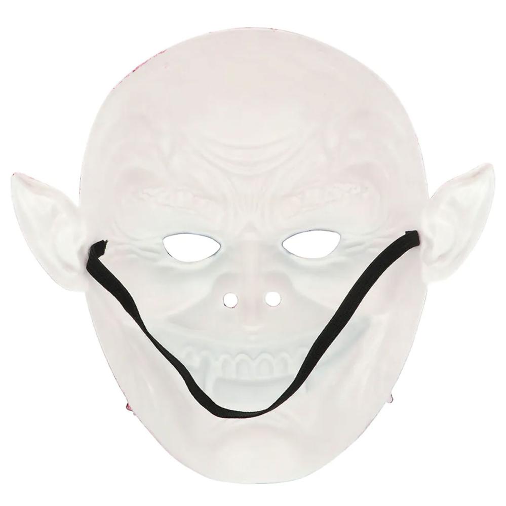 Blodig Vampyrmaske omfatter en hvit vampyrmaske med røde og svarte detaljer. Masken har hull til øynene og nesen og holdes på plass med et svart elastisk bånd.