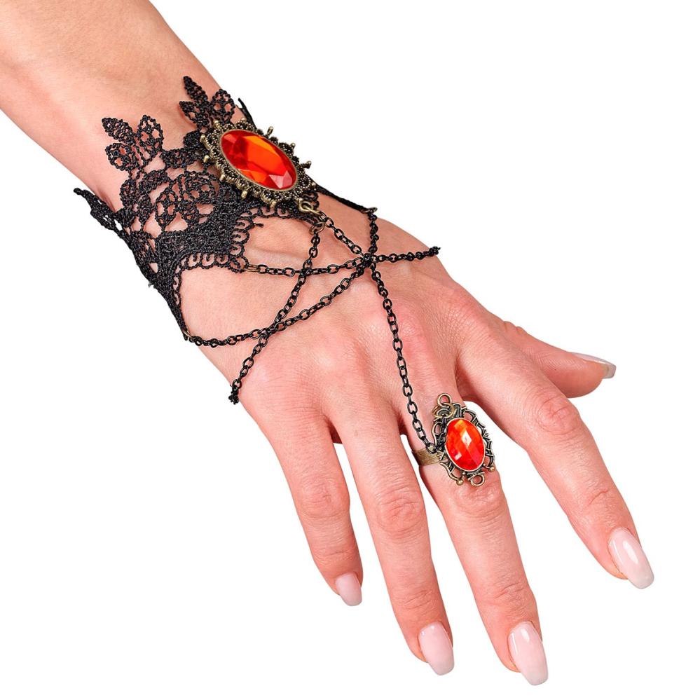 Blondearmbånd med Ring Svart/Rød omfatter et svart blondearmbånd og en ring, med hver sin store plastjuvel i rødt.