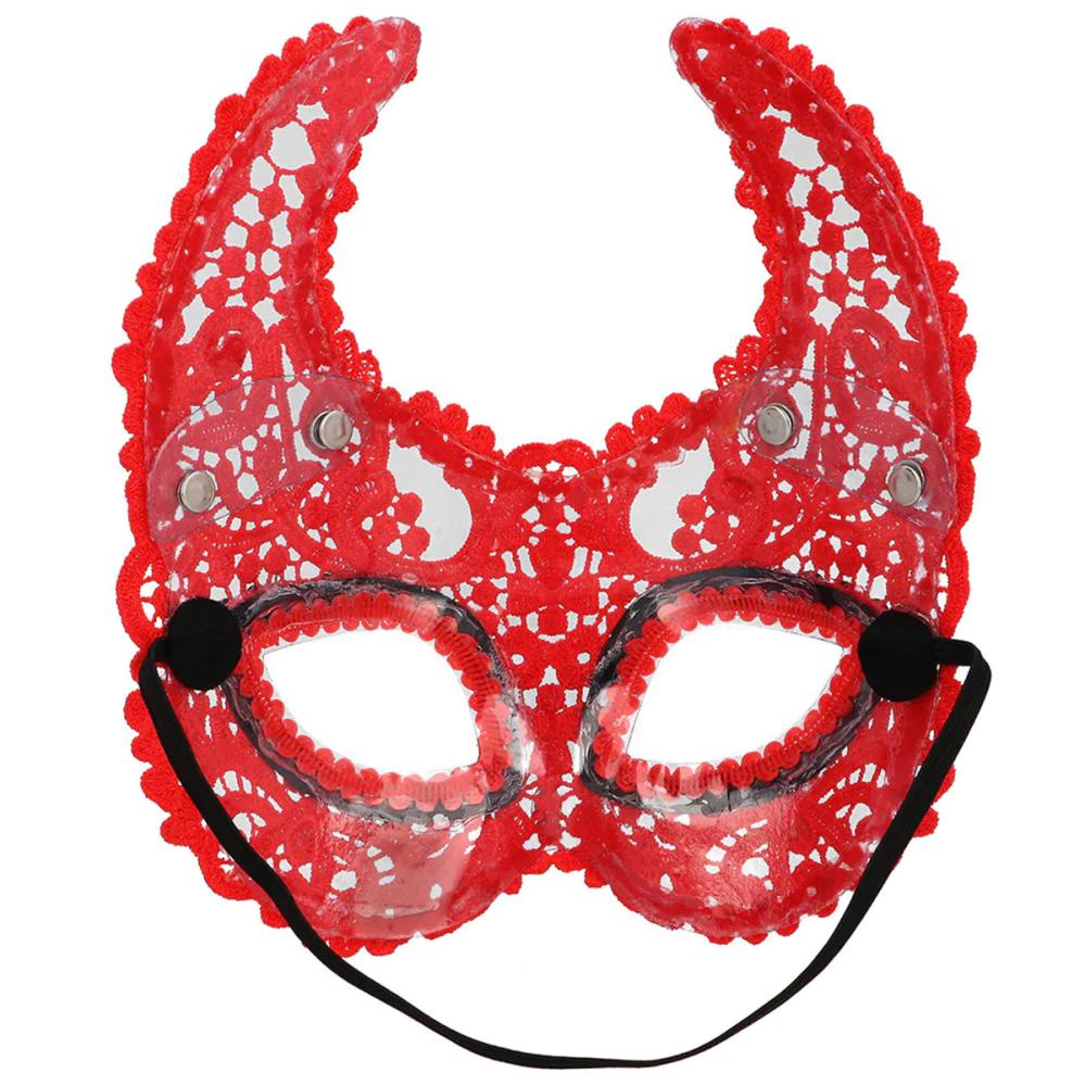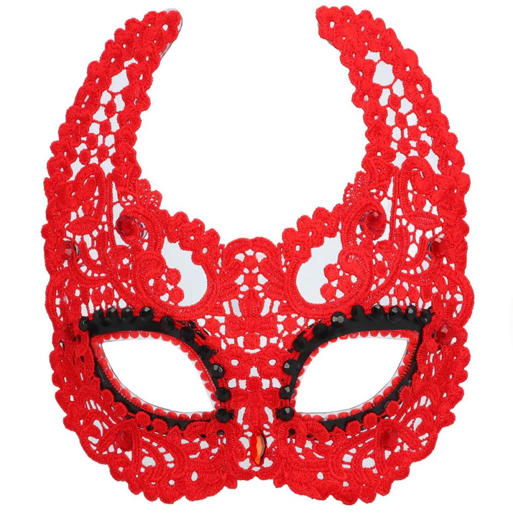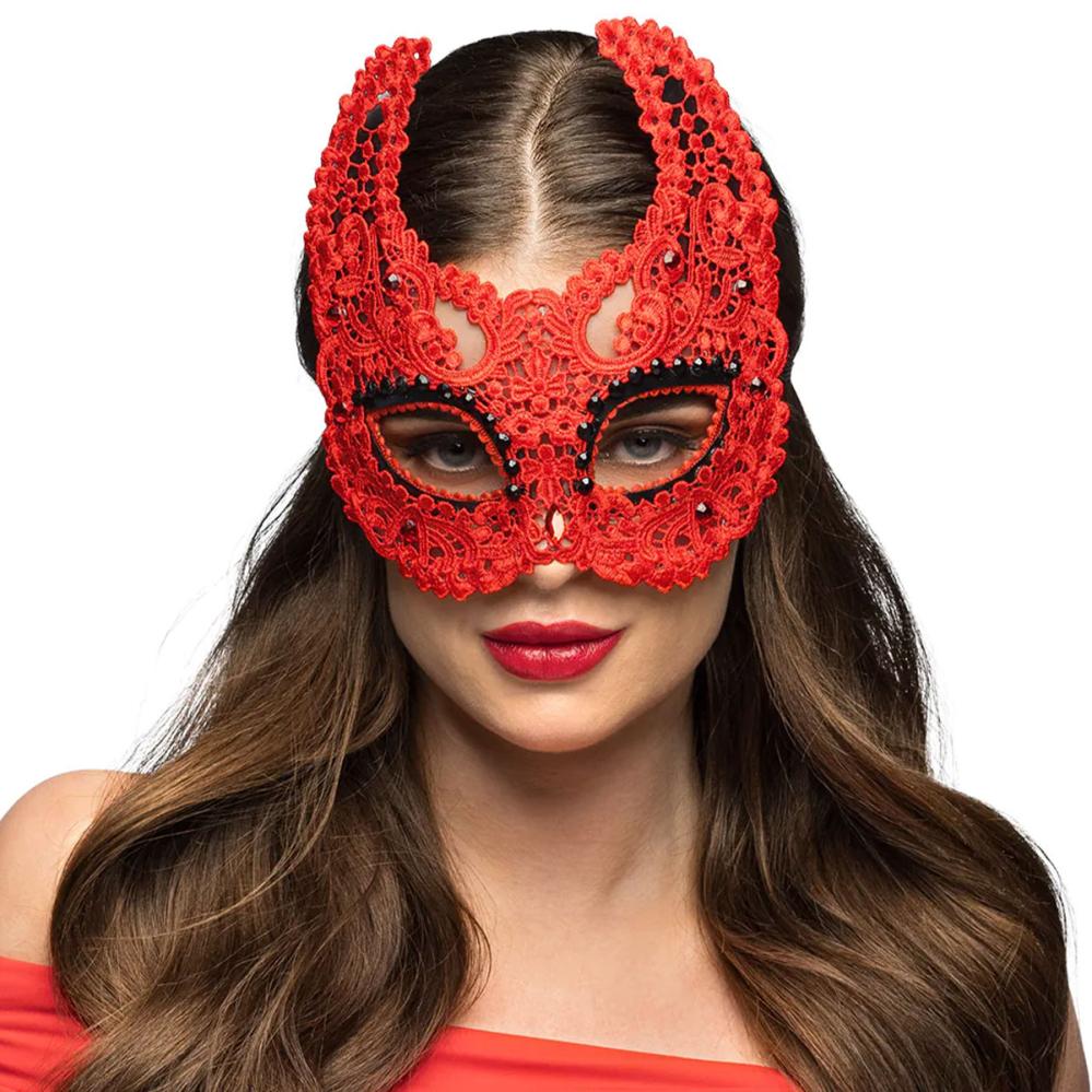 Blonder Djevelmaske Rød er en rød øyemaske som forestiller en djevel. Masken har små blondedetaljer, svarte og røde juveler og et svart elastisk bånd som holder den på plass.