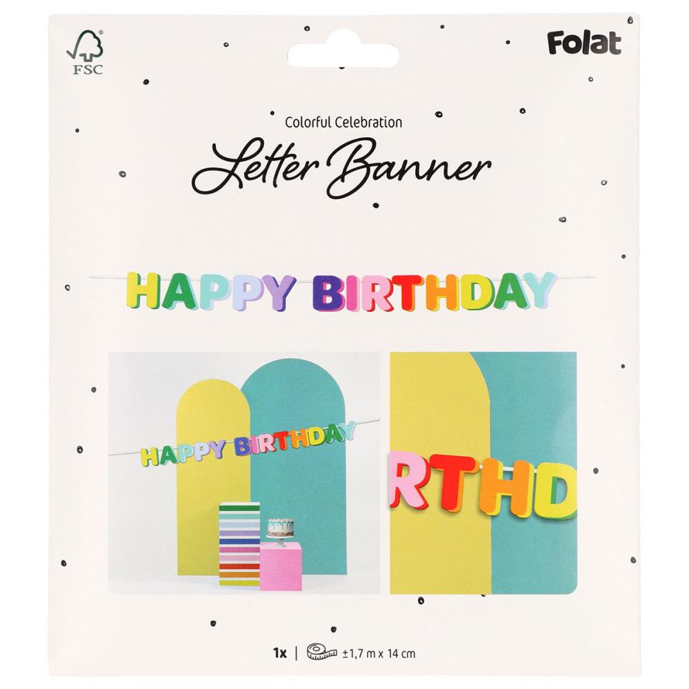 Bokstavgirlander Happy Birthday Flerfarget 1,7 m omfatter en fargerik girlander med bokstaver som staver ”HAPPY BIRTHDAY”, festet på et stilrent hvitt bånd.