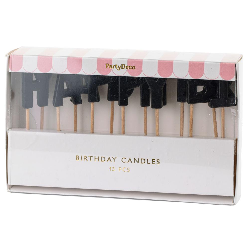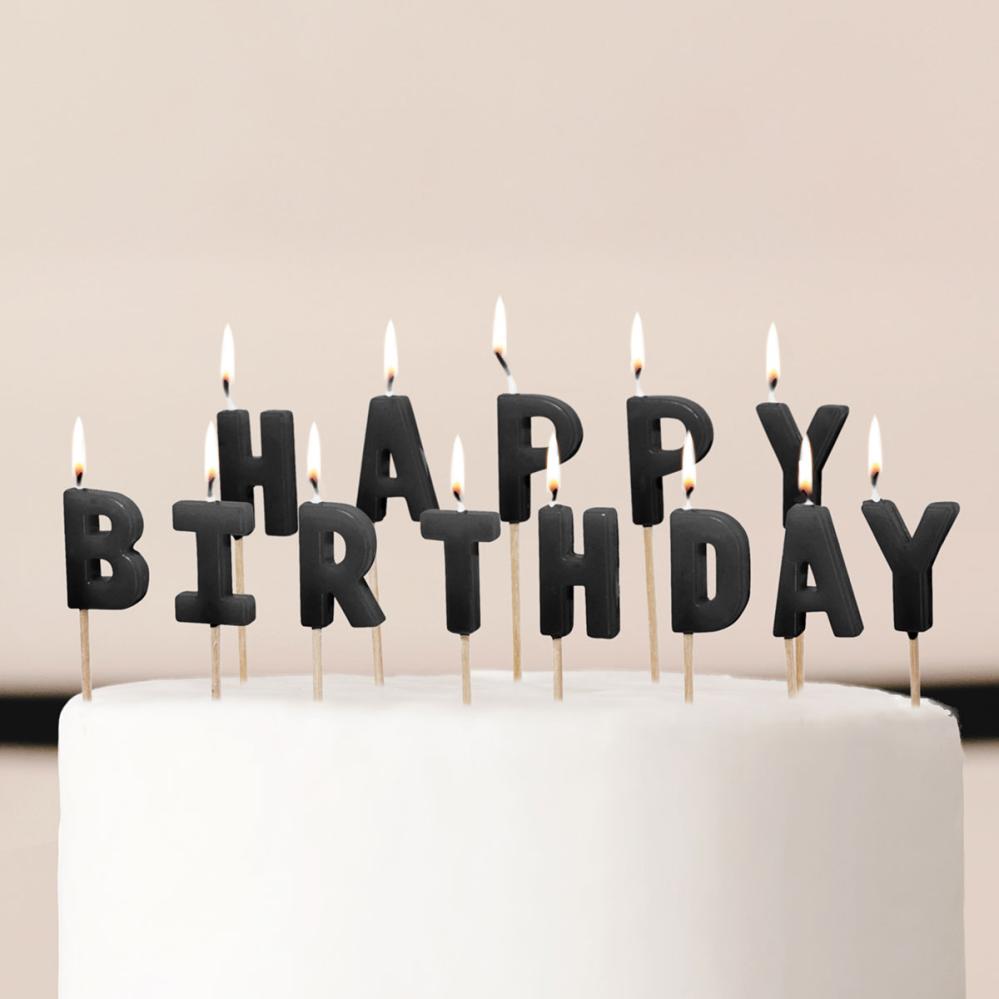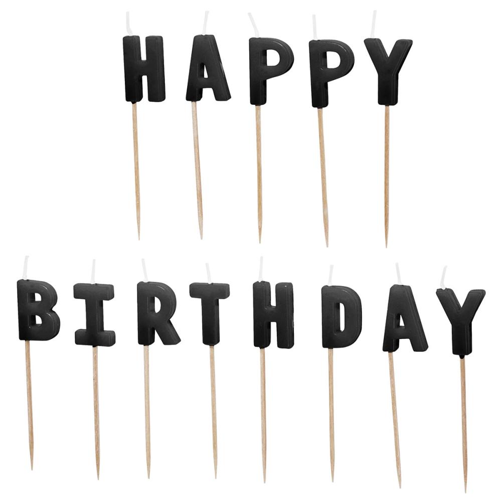 Bokstavlys Happy Birthday Svart består av tretten bokstavformede kakelys som danner teksten 'HAPPY BIRTHDAY' i svart. Lysene er montert på små trepinner, noe som gjør dem enkle å plassere i kaken.