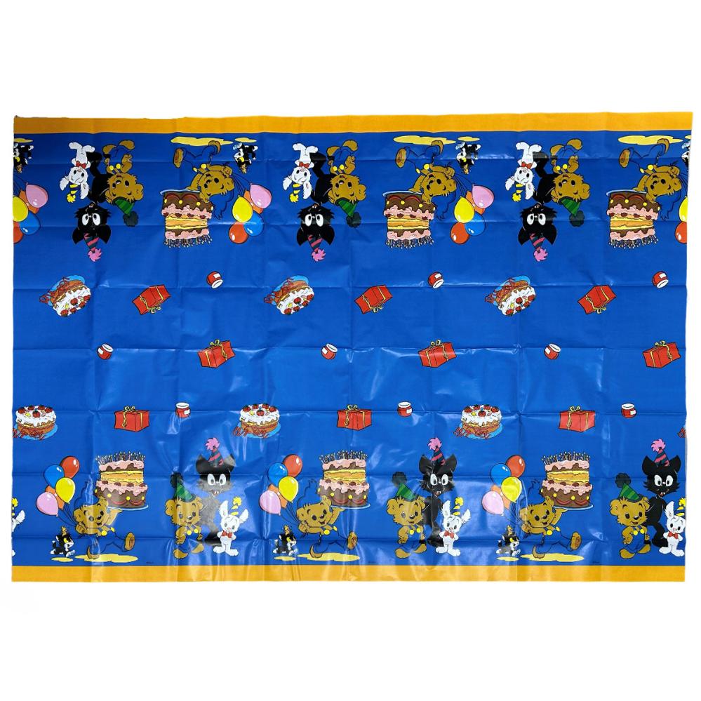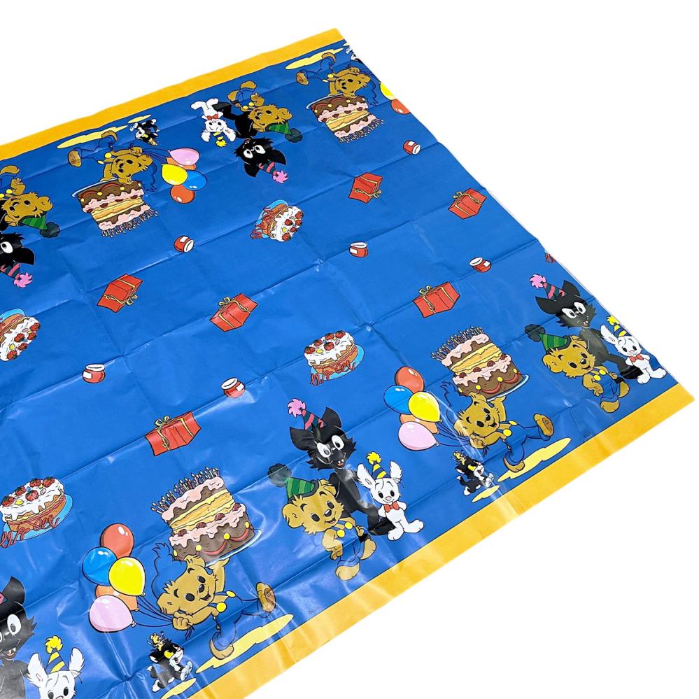 Bordduk Bamse omfatter en blå bordduk med gule striper langs sidene og motiv av Bamse, Lille Skutt og Ulven sammen med bursdagskaker, gaver, ballonger og honningkrukker.
