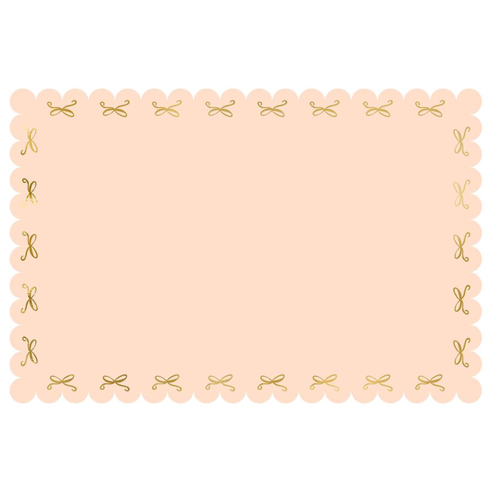 Bordduk med Gullsløyfer omfatter en bordduk med bølgete kanter, i lys ferskenfarge, dekorert med gullfargede sløyfer langs kantene.