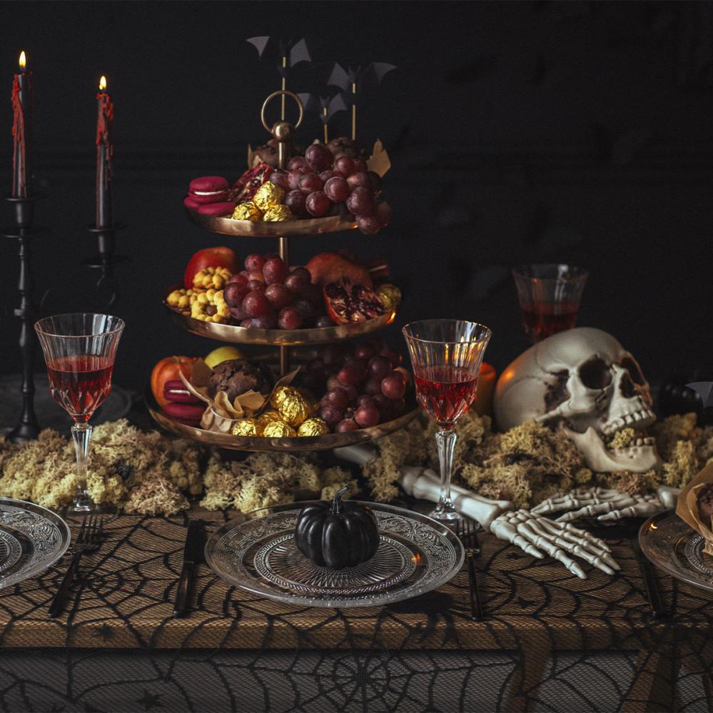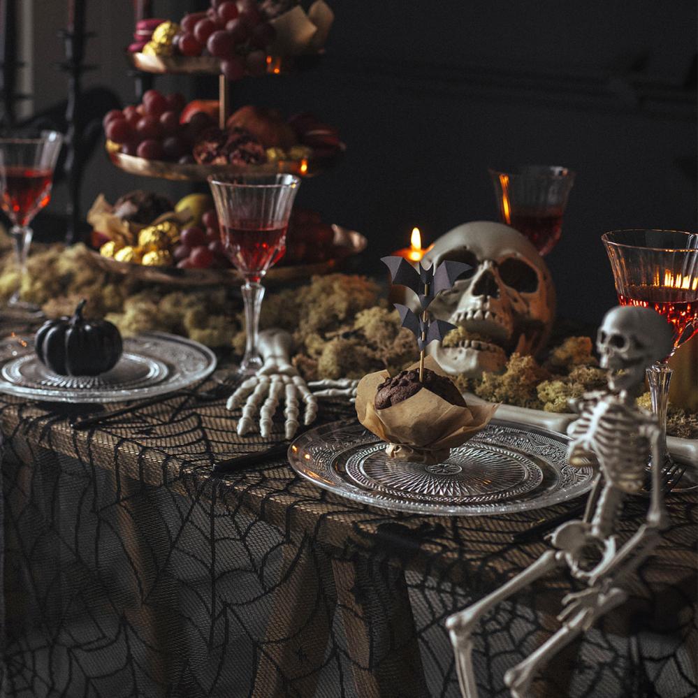 Når halloween nærmer seg passer den svarte bordduken perfekt til borddekking og skaper umiddelbart riktig stemning. Det stilrene spindelvevmønsteret forsterker feststemningen ved hvert bord. Materialet er lett å legge på, noe som gjør forberedelsene enkle.