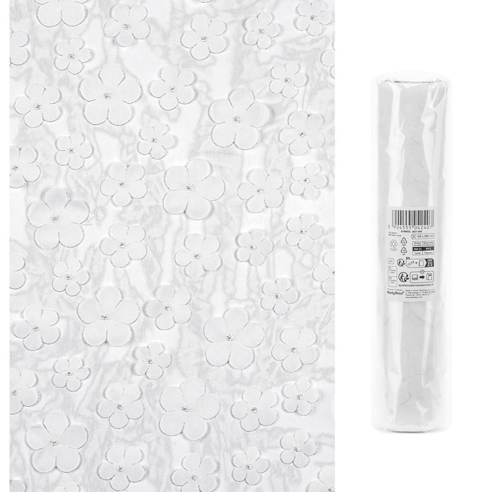 Bordløper Blomster Hvit omfatter en hvit bordløper av nettingstoff med blomstermønster.