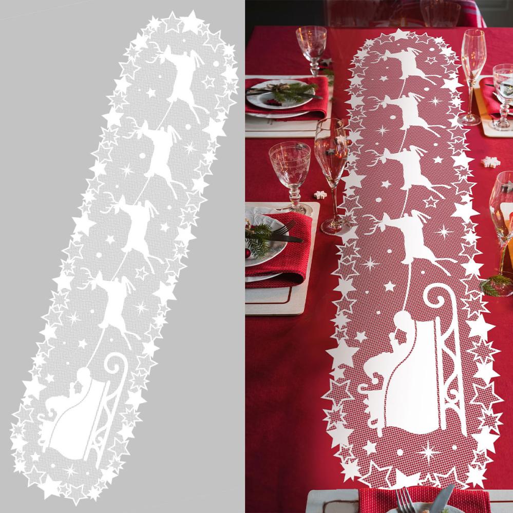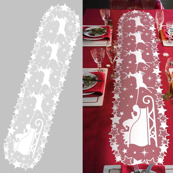 Bordløper Julenissens Slede omfatter en dekorativ hvit bordløper med nettingstoffdetaljer, stjerner rundt kanten og et julemotiv som forestiller julenissen i sleden sin som trekkes av fire reinsdyr.
