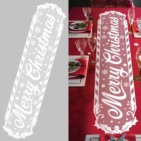 Bordløper Merry Christmas er en dekorativ hvit bordløper med nettingstoffdetaljer, julemotiv og teksten ”Merry Christmas”.
