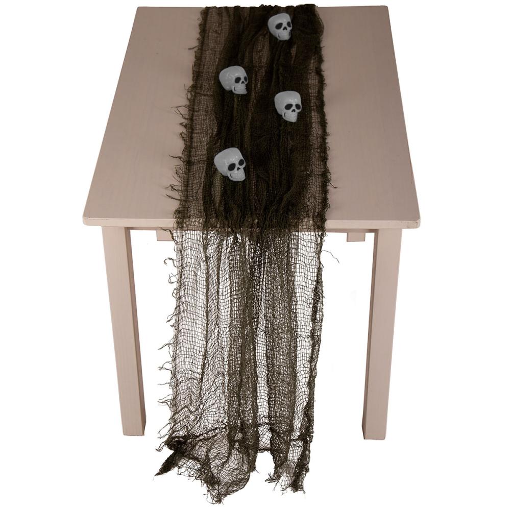 Bordløper Nettingstoff & Hodeskaller omfatter en mørkegrønn bordløper i form av et nettingstoff samt fire små dekorative hodeskaller som er hvite og har svarte detaljer.