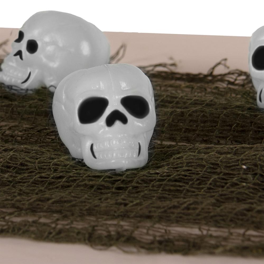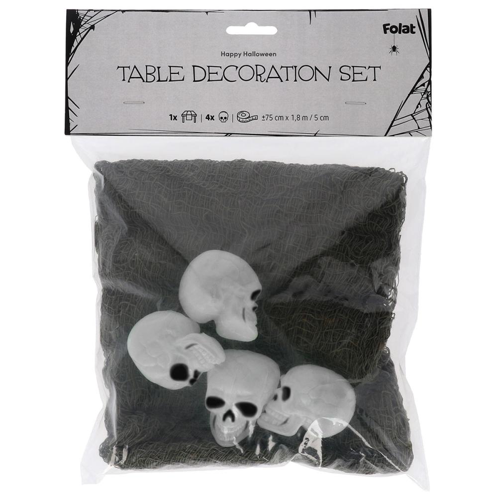 Sett stemningen med en Halloween bordsdekorasjon pyntet med nettingstoff i mørkegrønt og fire skumle hodeskaller. Perfekt til Halloween festtema eller som halloweenfestdekorasjon på buffetbordet.