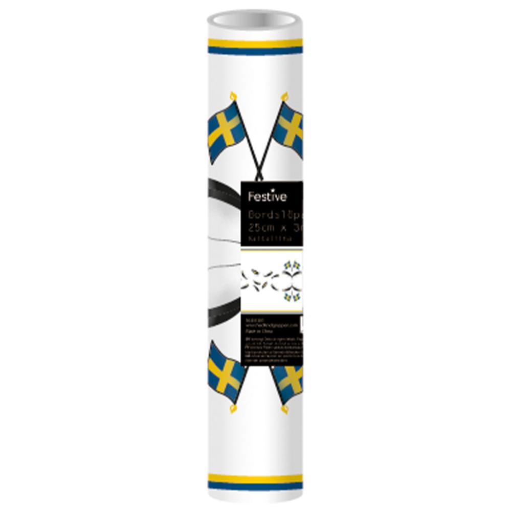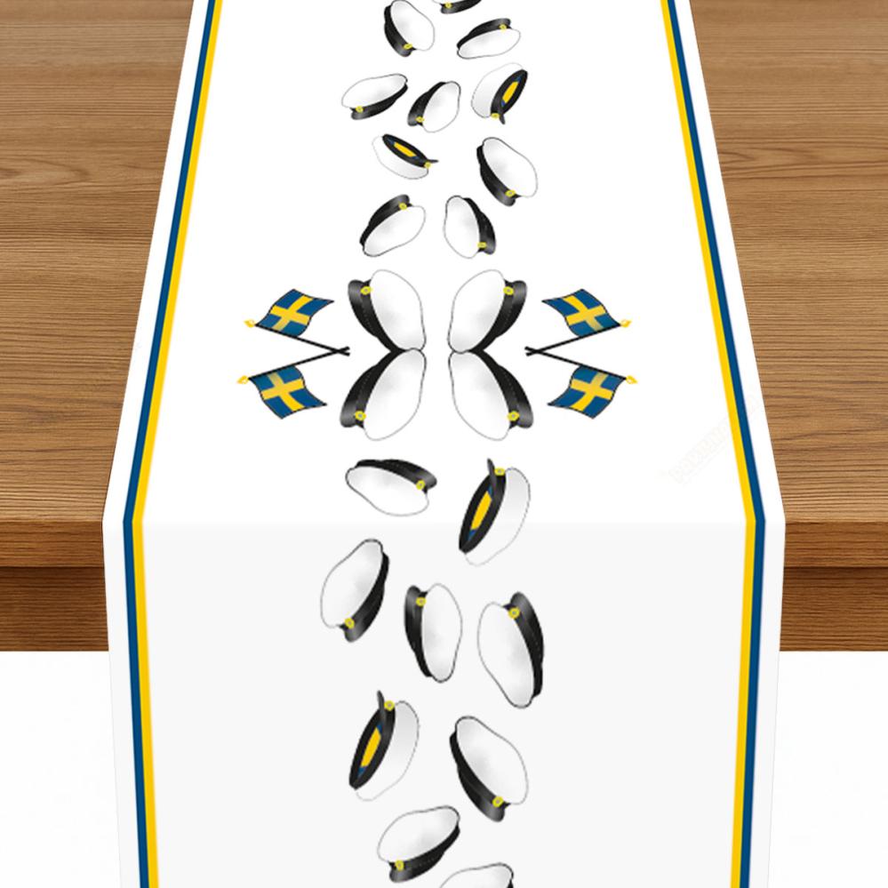 Bordløper Studenten omfatter en hvit bordløper med trykk av studentluer, svenske flagg samt blå og gule striper langs sidene.