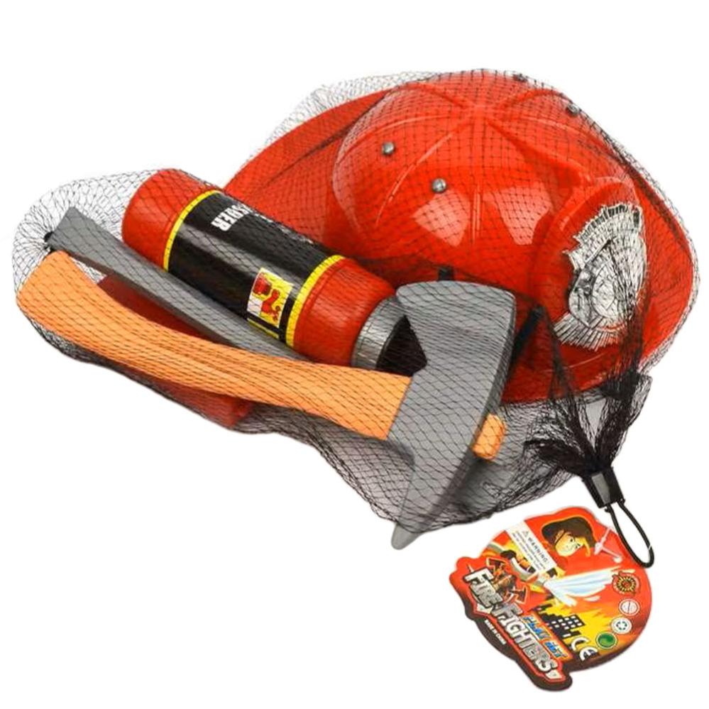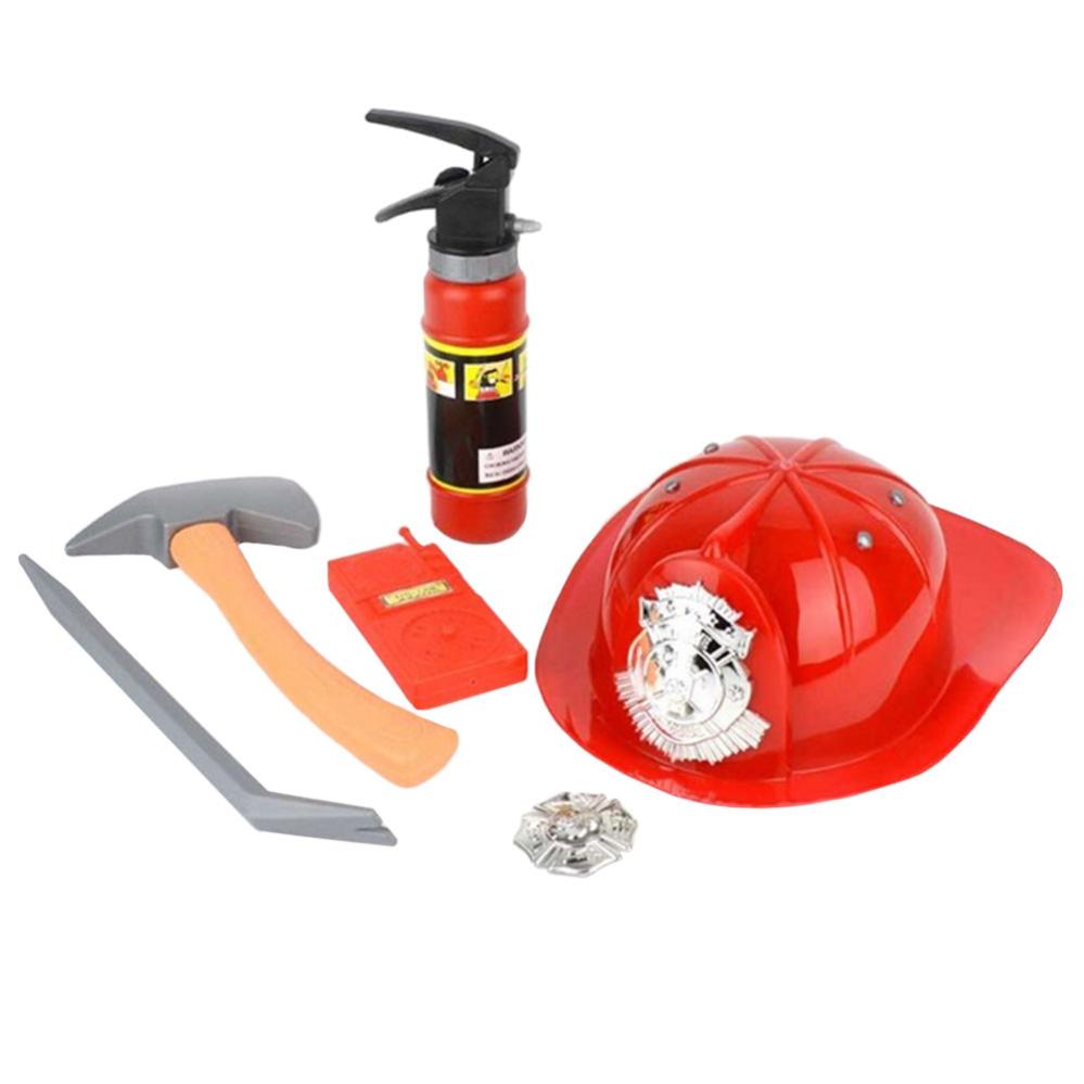 Brannmann Sett omfatter et kit med rød hjelm, en brekkstang, en brannslukker, en øks, en radio og et brannmann merke.