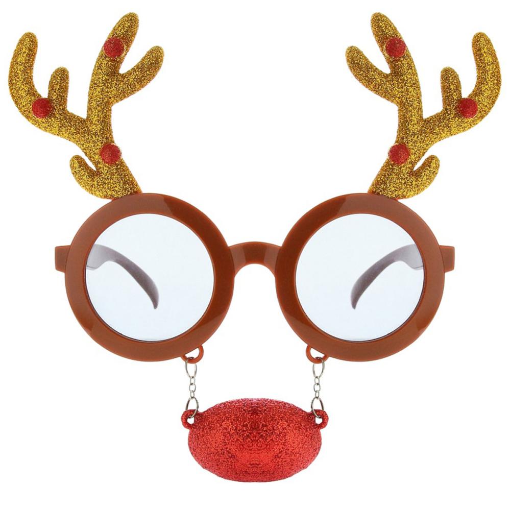 Briller med Reinsdyrhorn og -nese omfatter et par briller med røde linser og brun innfatning, dekorert med en reinsdyrnese i rødt glitter samt oppstående reinsdyrhorn i gullglitter med røde detaljer.
