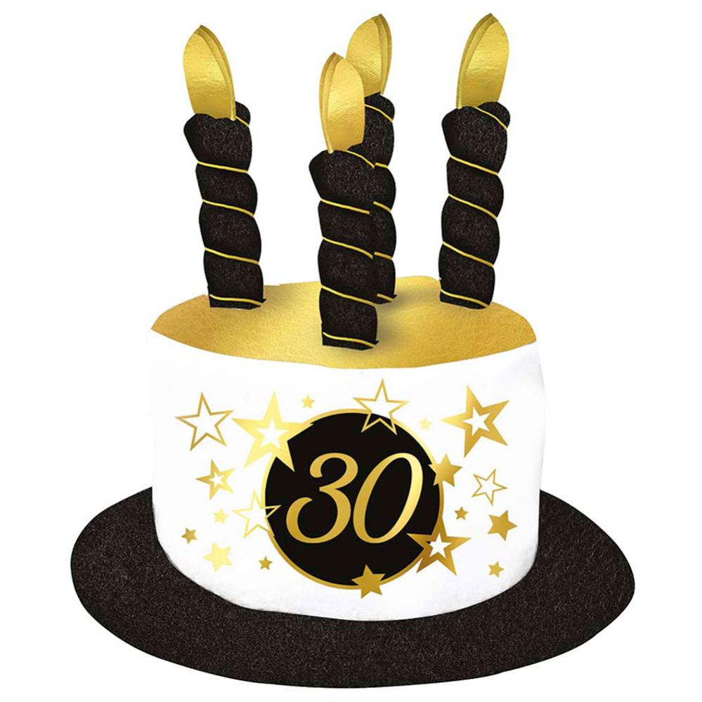 Bursdagshatt 30 år omfatter en hatt i svart, hvit og gull, formet som en kake med fire lys og motiv av tallet 30 samt stjerner.