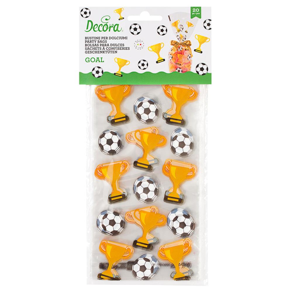 De transparente cellofanposene med fotballmotiv i en pakke med tjue gir en festlig avslutning på en fest med fotballtema. Perfekte godteposer for barn som vil gjøre sin egen fotballbursdag ekstra morsom og minneverdig.