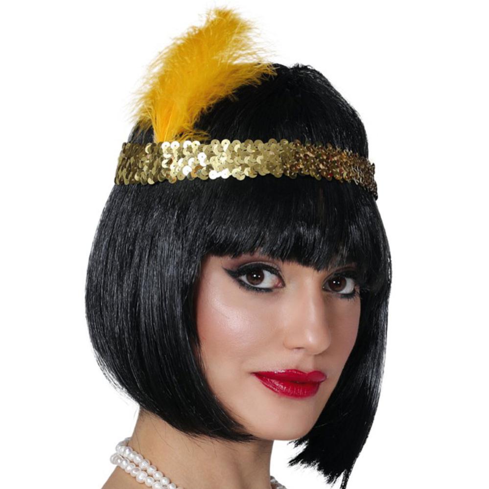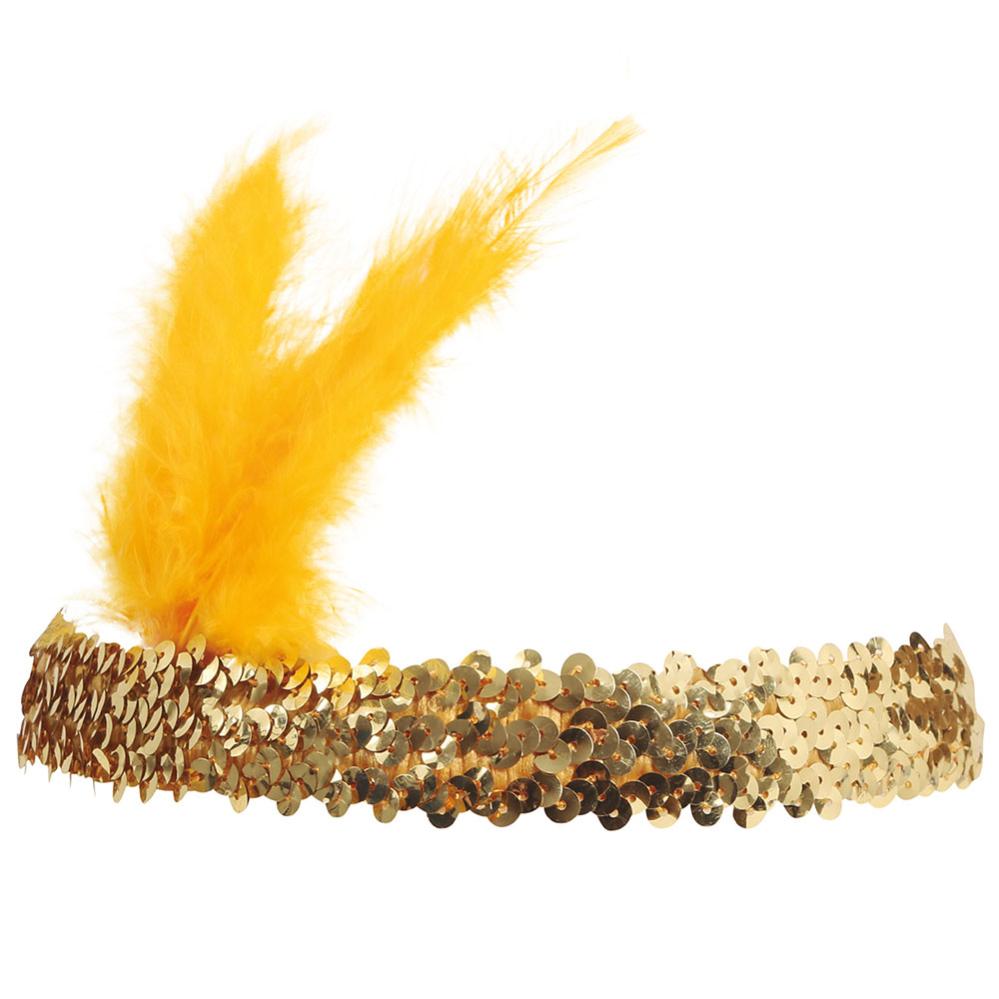 Charleston Hårbånd med Fjær Gull omfatter et hårbånd med strikk, gule fjær og gullfargede perler.