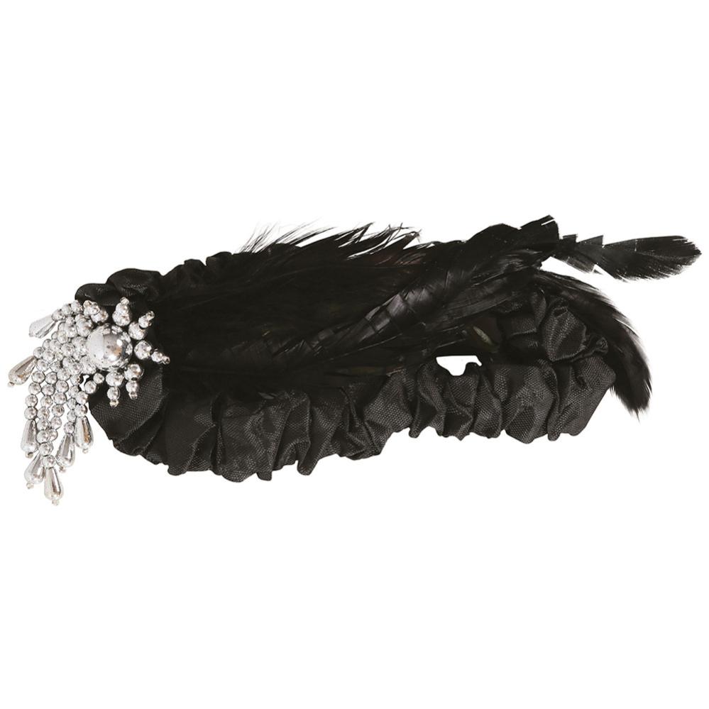 Charleston Hårbånd med Fjær Svart omfatter et svart hårbånd med elastikk samt lange fjær og sølvfargede perler.