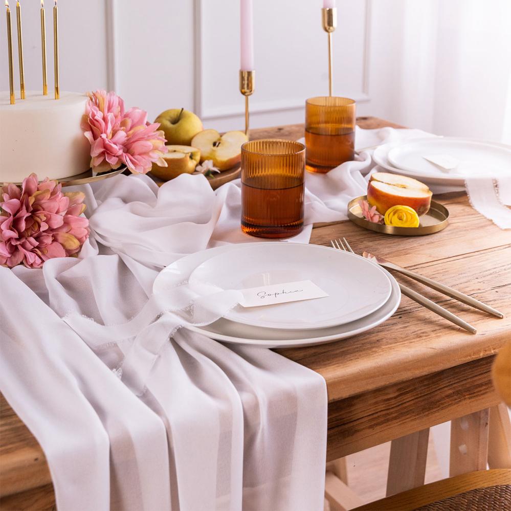 Med en bordløper på rull får du enkelt en hvit borddekking som passer perfekt til bryllup og andre festlige anledninger. En bryllupsborddekking med chiffon i elfenbenshvit gir et romantisk og lyst inntrykk på alle bord.