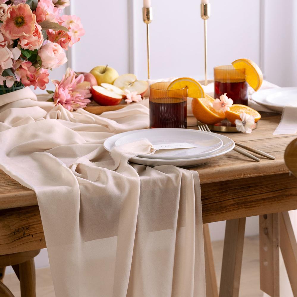 Å dekorere til et vakkert bryllup blir enkelt med en bordløper på rull, der den hvite nyansen passer like godt til en elegant borddekking som til seremonien ved bryllupet. Bryllupsdekkingen får et lyst og mykt uttrykk av chiffonens fine materiale.