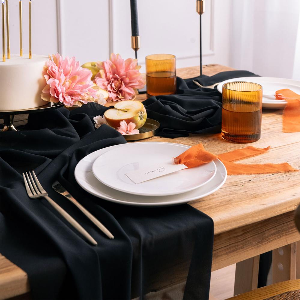 Til en borddekking som preges av halloween passer en bordløper i svart veldig bra, særlig siden denne bordløperen leveres på rull, noe som gjør det enkelt å tilpasse den etter bordets størrelse. Chiffon gir dessuten en myk og elegant følelse.