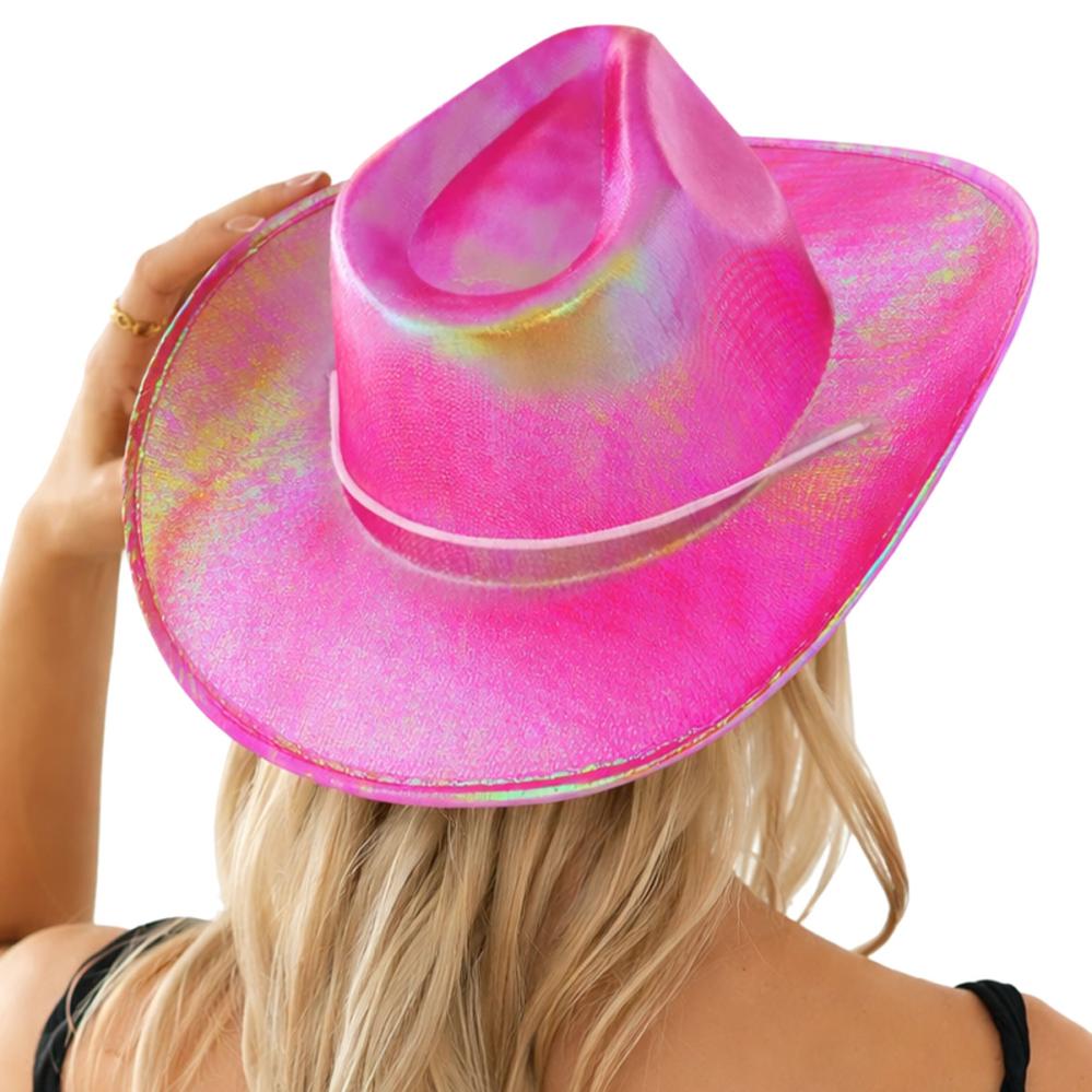 Cowboyhatt Iriserende Rosa omfatter en rosa westernhatt som avgir grønt og blått skimmer ved lys og bevegelse. Hatten har en hvit snor som strammes under haken for perfekt passform.