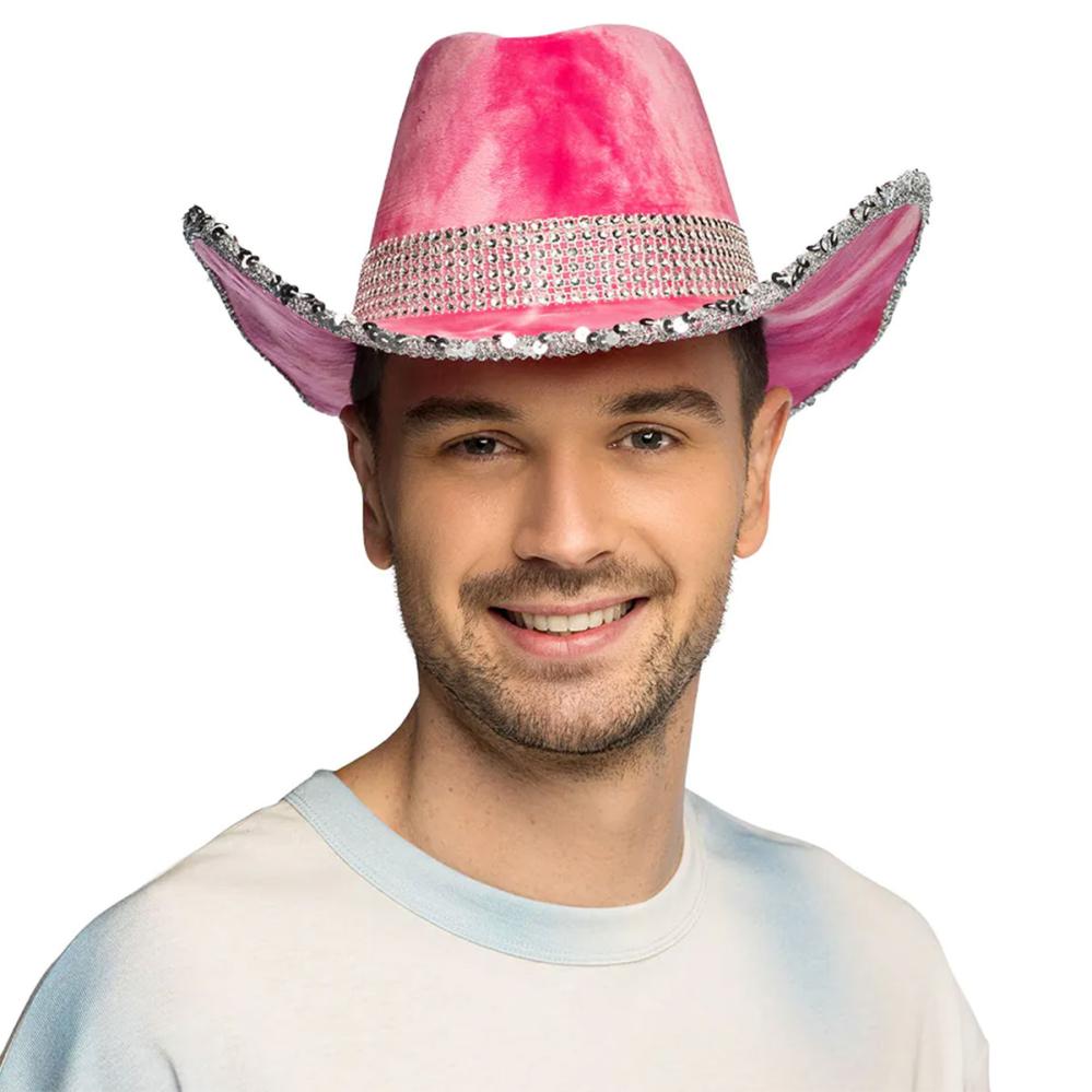 Cowboyhatt med Rhinestone og Paljetter Rosa omfatter en rosa cowboyhatt i semsketlignende materiale, dekorert med et bånd av sølvfargede rhinestones rundt og en sølvfarget kant med paljetter.