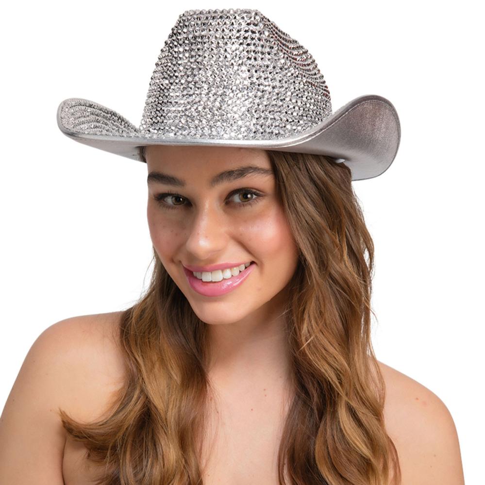 Cowboyhatt med Strass omfatter en sølvfarget cowboyhatt, dekket av sølvfarget strass. Hatten holdes på plass med en hvit justerbar snor under haken.
