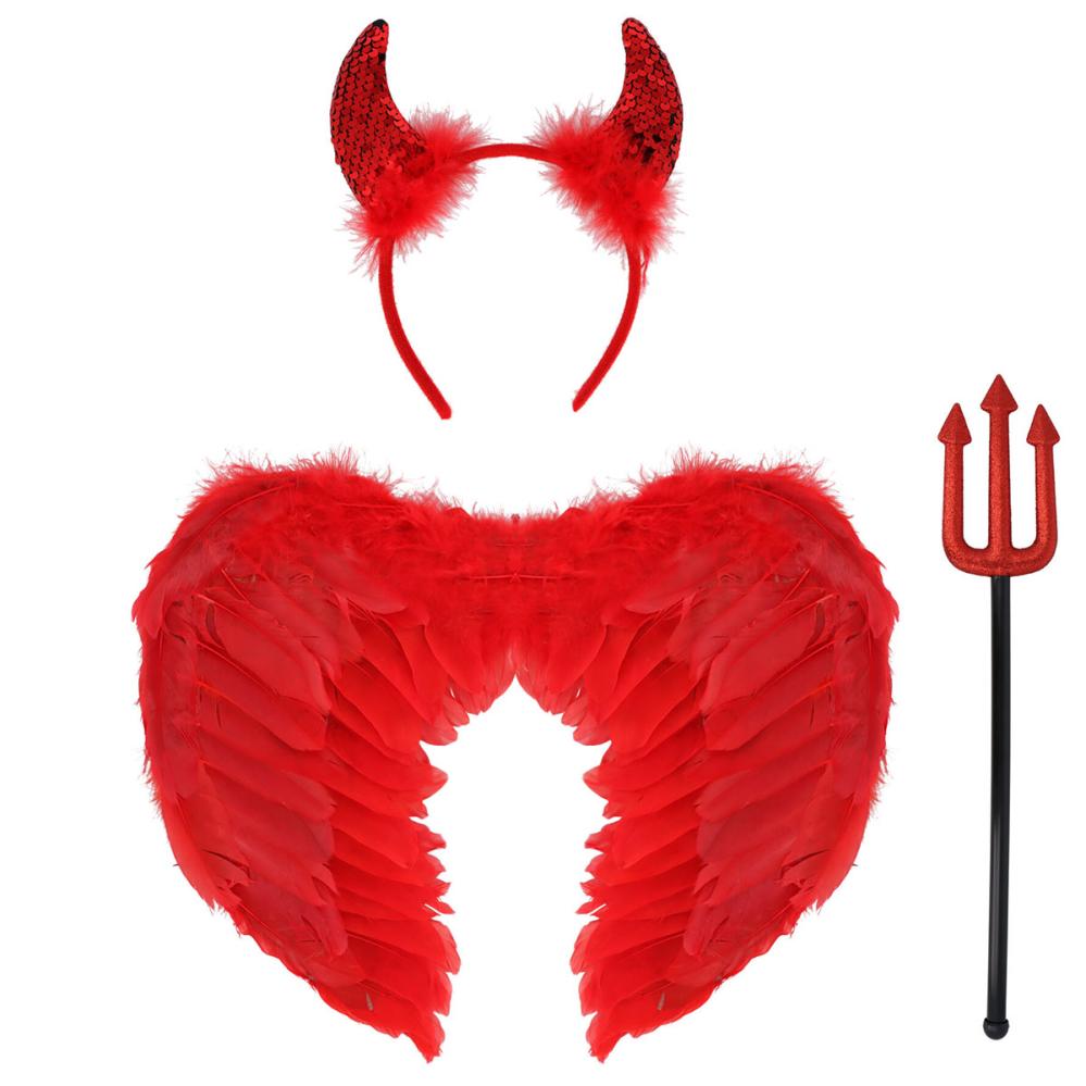 Djevelsett omfatter et rødt sett som inneholder fjærkledde røde vinger med røde elastiske bånd som bæres over skuldrene, et rødt stofftrukket diadem med røde djevelhorn dekorert med paljetter på den ene siden, samt en kort trefork som har et svart skaft.