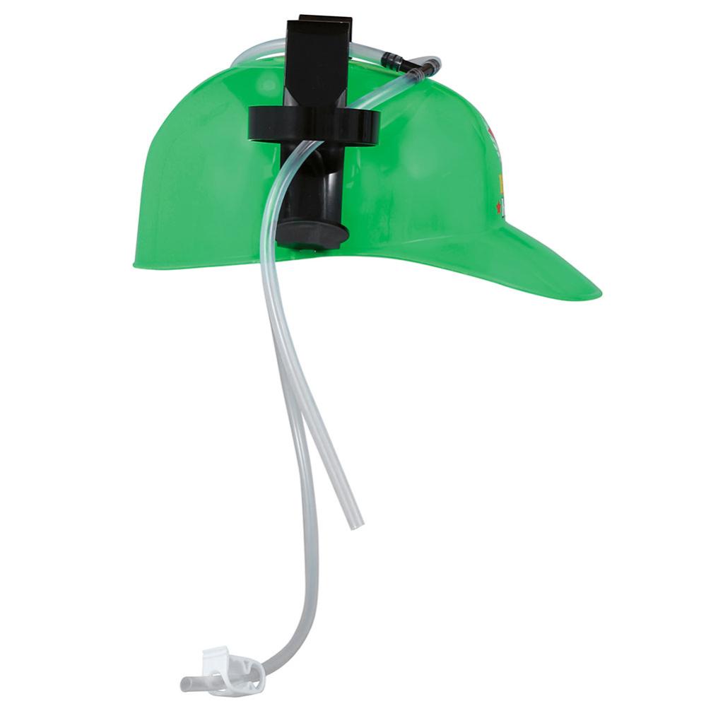 Drikkehjelm Beer KIng er en justerbar neongrønn hjelm med ølmotiv. Den har en svart holder for to bokser og et langt gjennomsiktig sugerør.